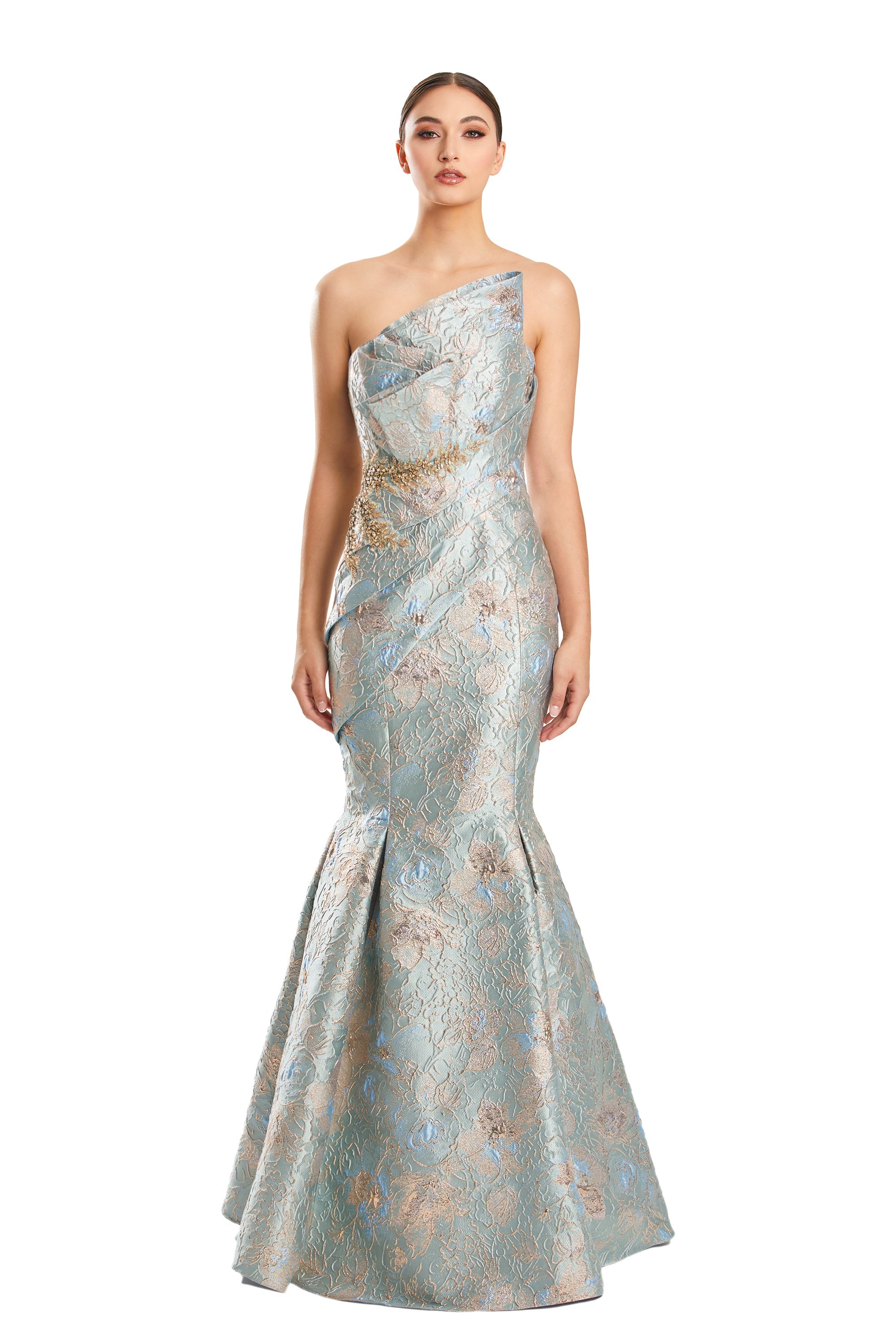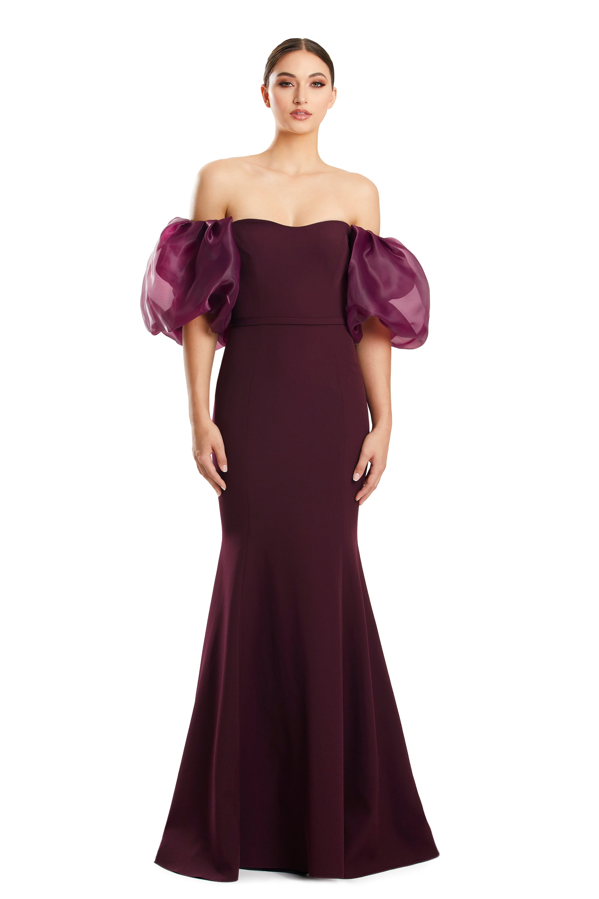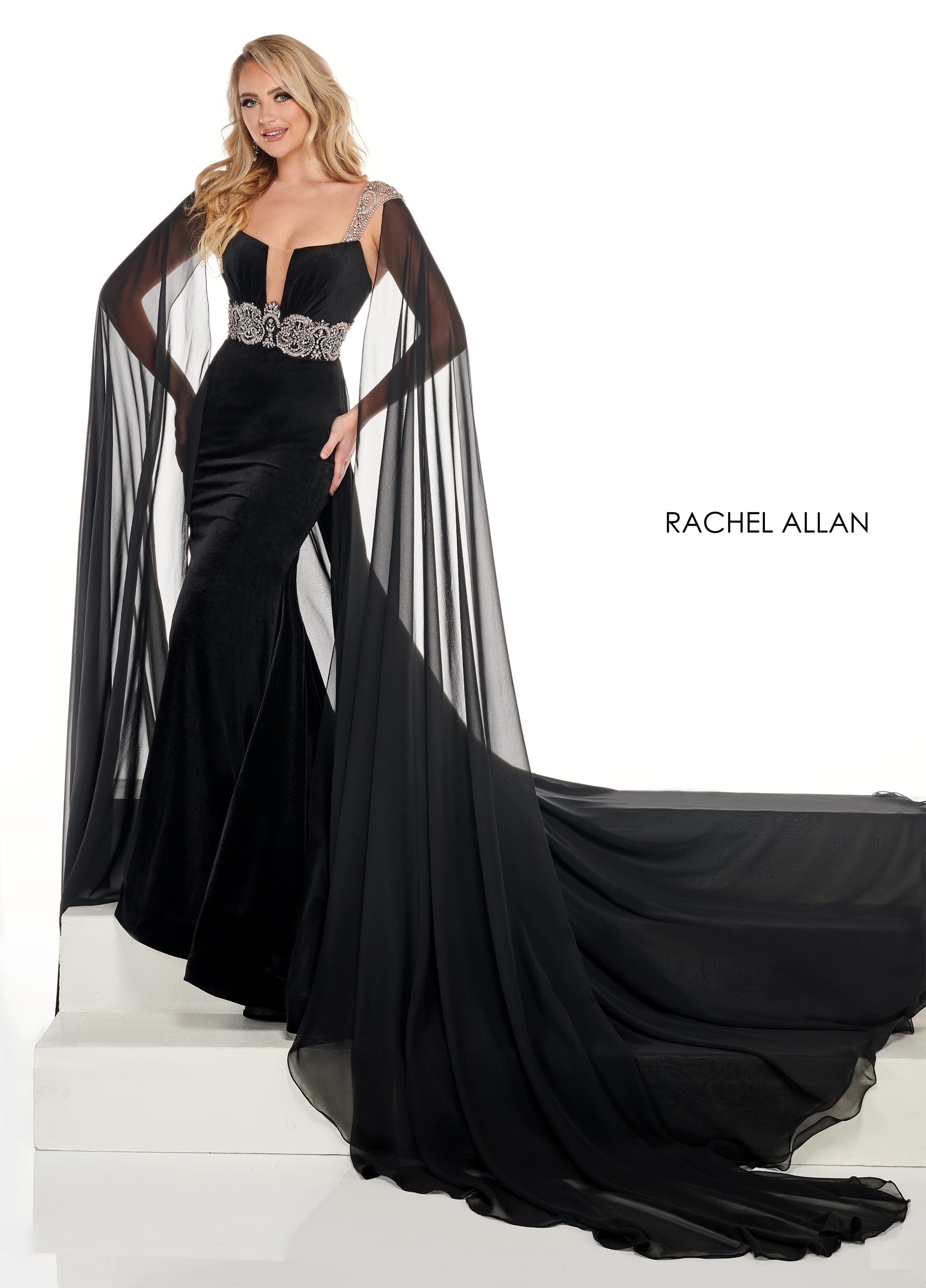 We like to call this one 'epic'. This velvet/chiffon combo is one for the books. You will keep conversation flowing describing the flattering silhouette designed with a chiffon cape-like effect flowing from the shoulders.