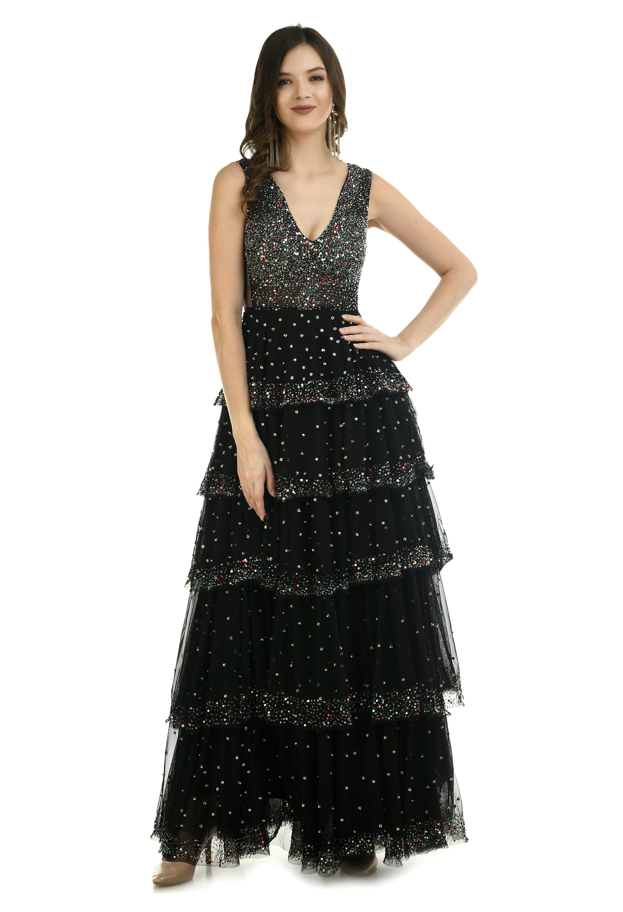 Beautiful off-the-shoulder gown, with thick embroidered lace from top to bottom.