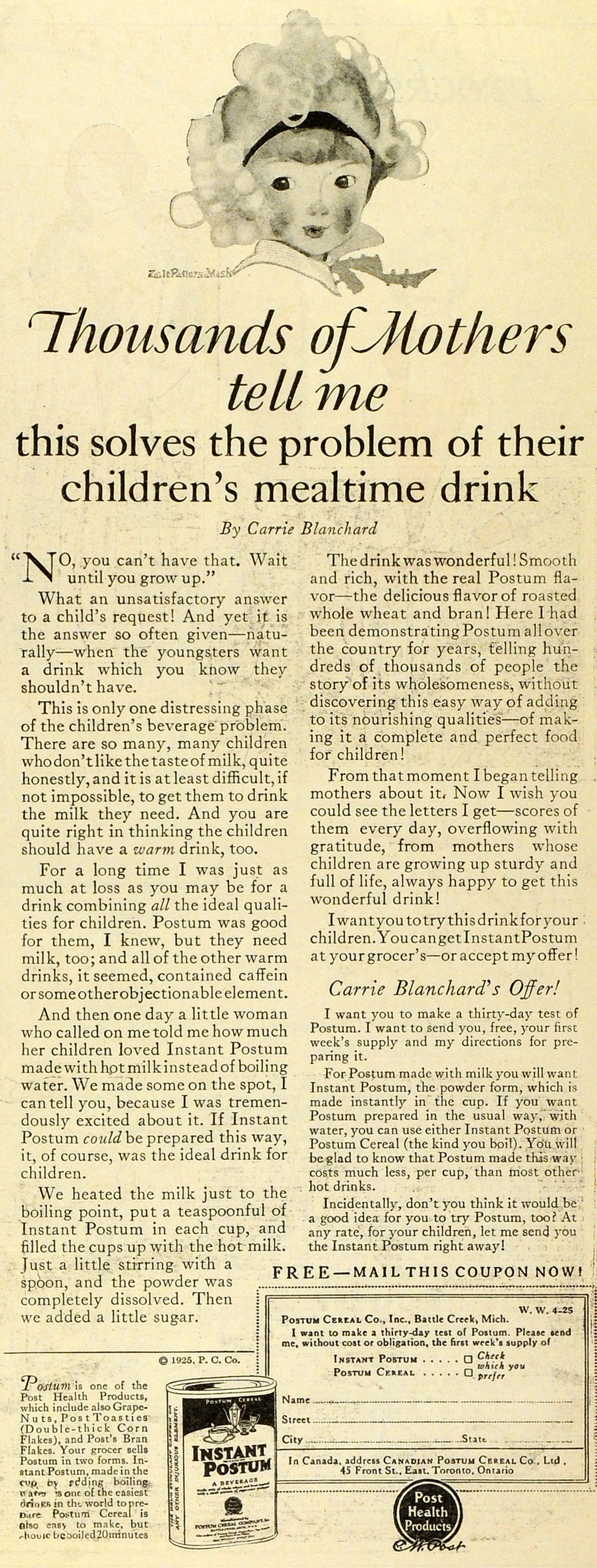 Early on The Postum Cereal Company utilized innovative (for the time) marketing techniques, including free samples, product demonstrations, factory tours, recipe booklets, coupons and, of course, extensive advertising.