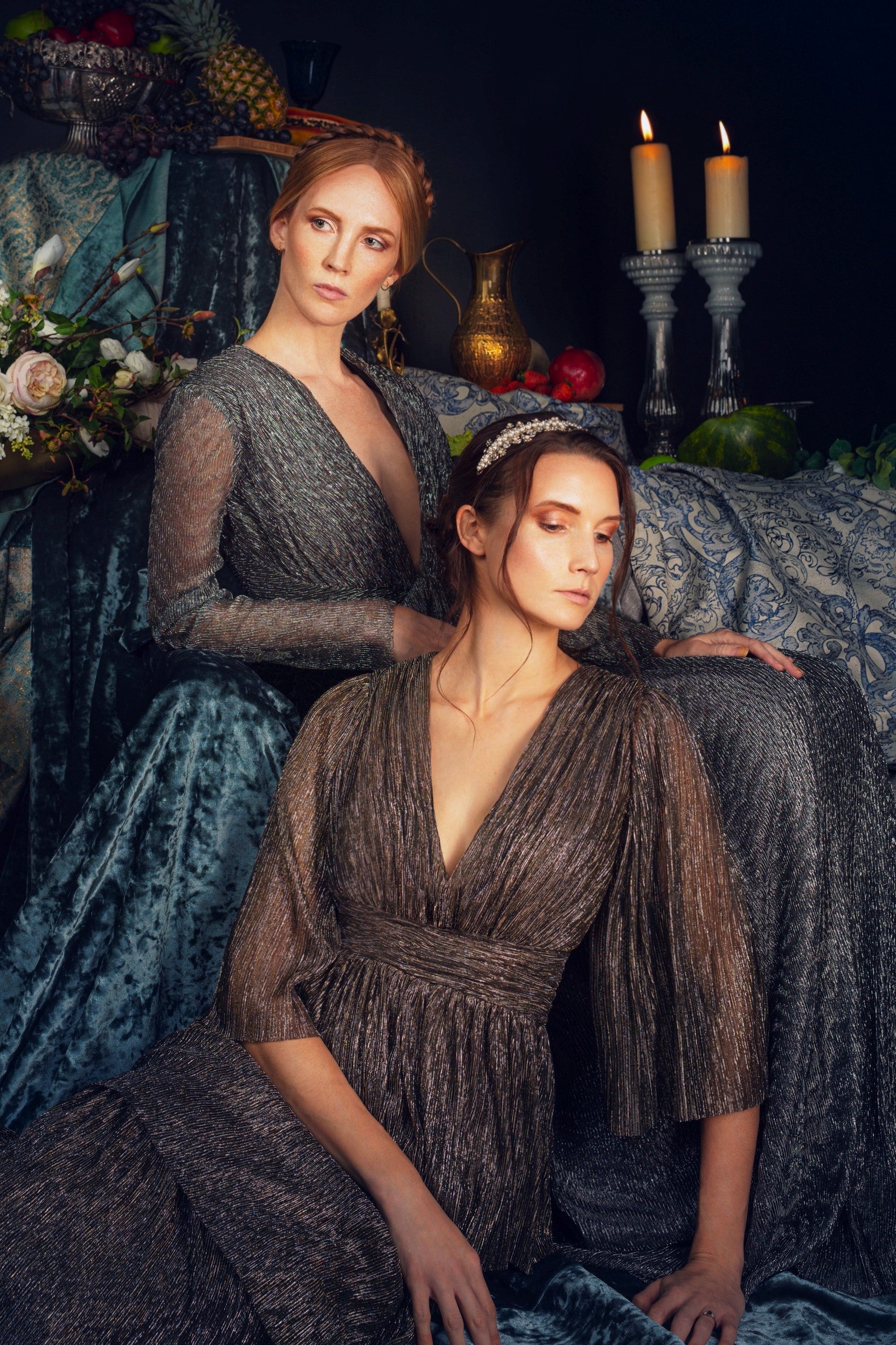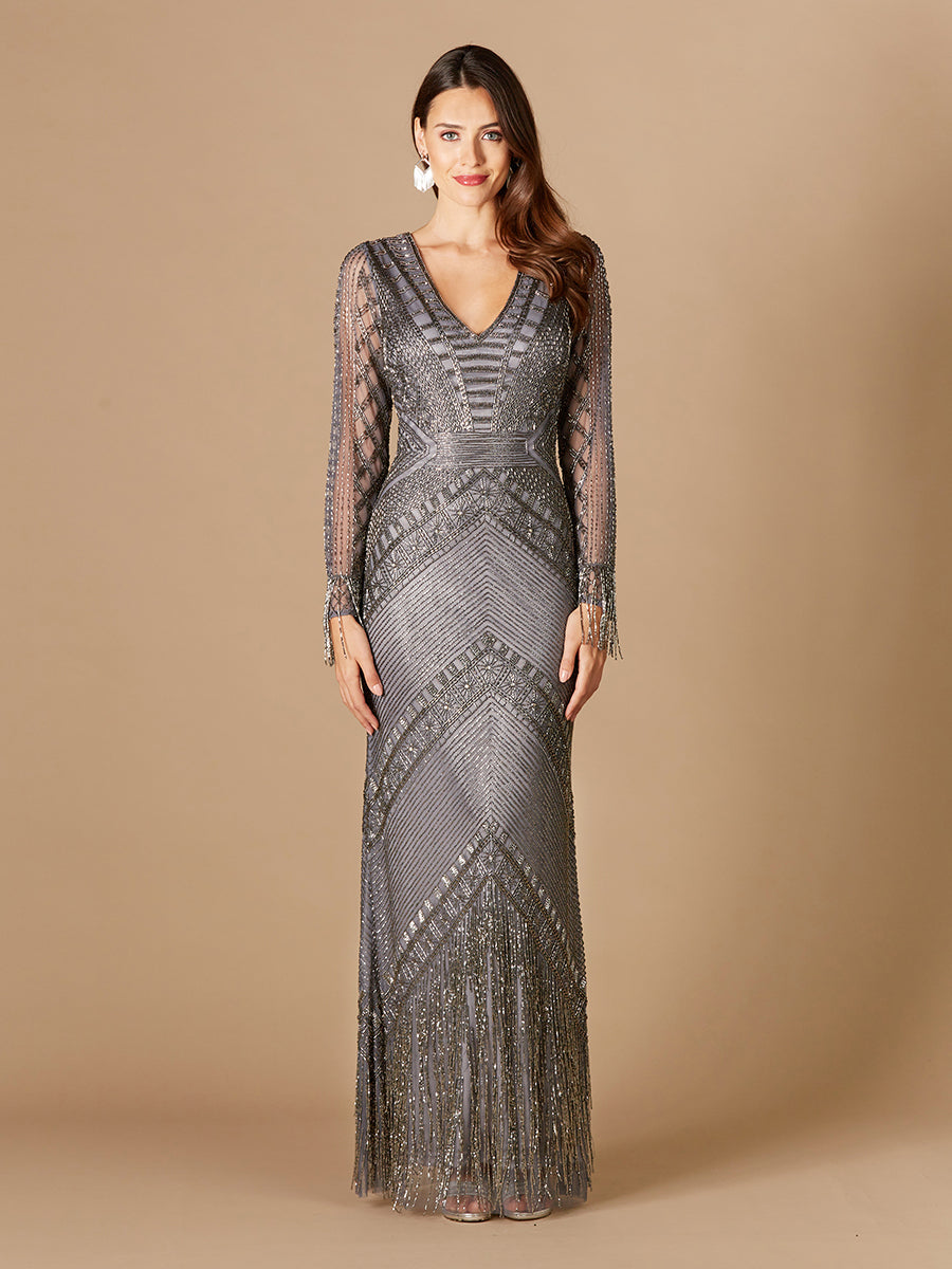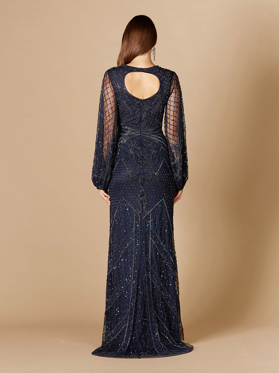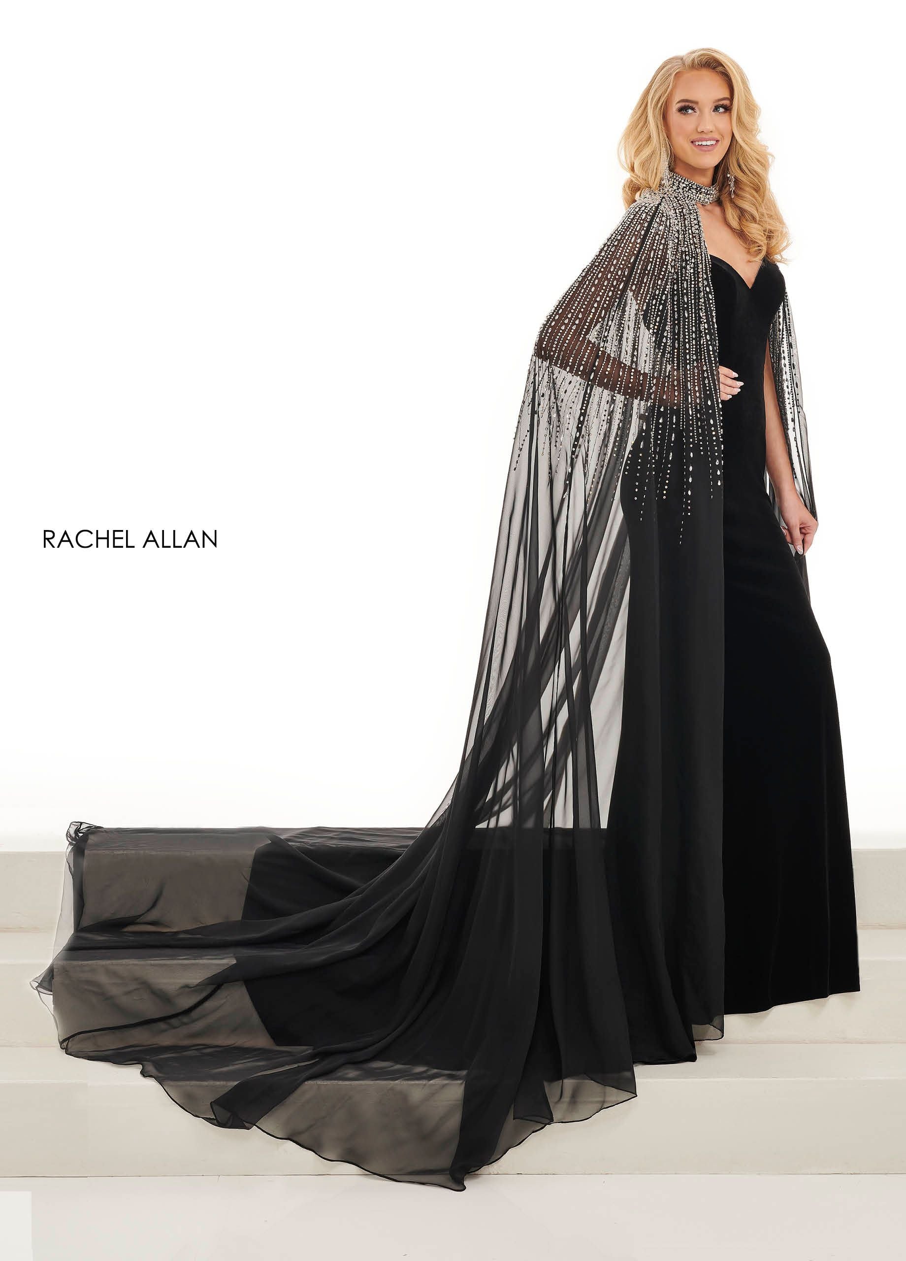 Dazzle the judges in this fitted long velvet gown made with a chiffon cape fully beaded on the shoulders and scattered throughout. The detachable cape leaves a slimming sweetheart neckline perfect for any occasion.