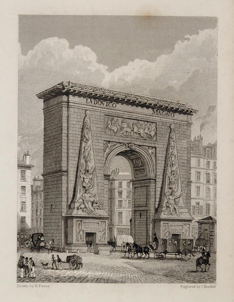 This is an original 1831 copper engraving of the Porte Saint-Denis in Paris, a Triumphal Arch commissioned by Louis XIV to commemorate his military victories.