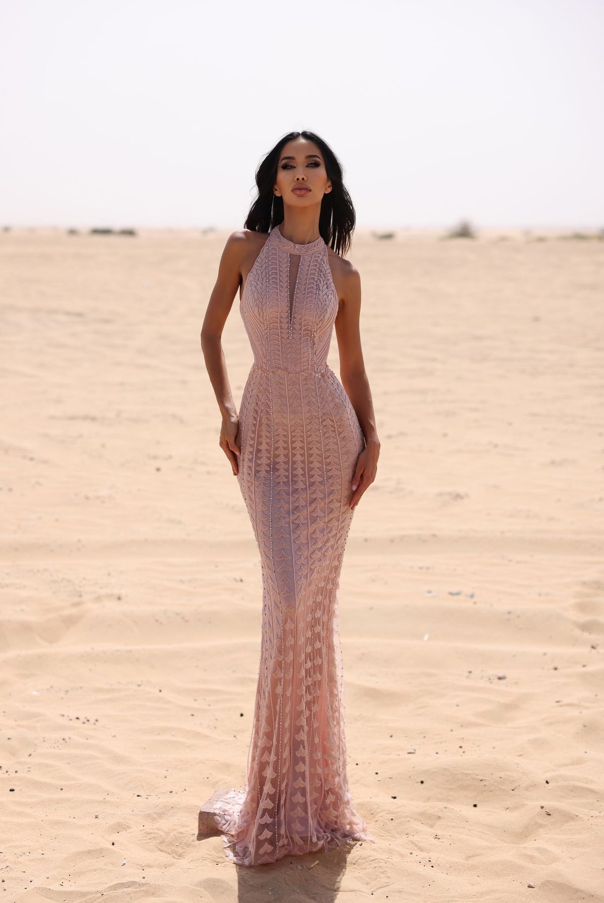 Hello Halter! Dying over this pastel colored dress embellished with iridescent sequins? Same girl, same! This gowns speaks for itself.