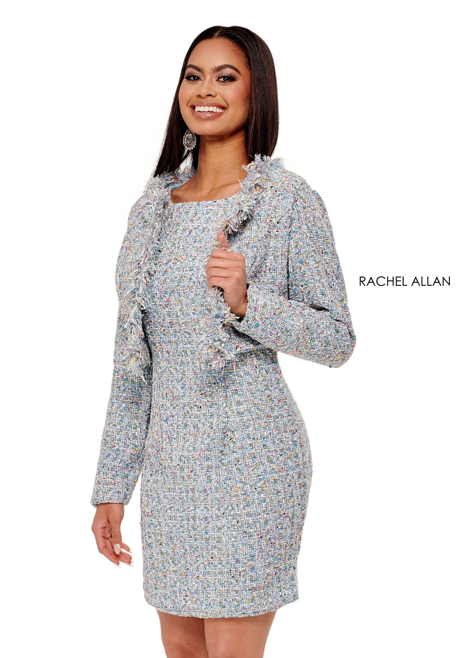 You'll be interview ready in this fitted mini tweed dress designed with a square neckline and a matching tweed jacket. The jacket is made with a distressed hem along the collar and opening completing this stunning pageant piece.