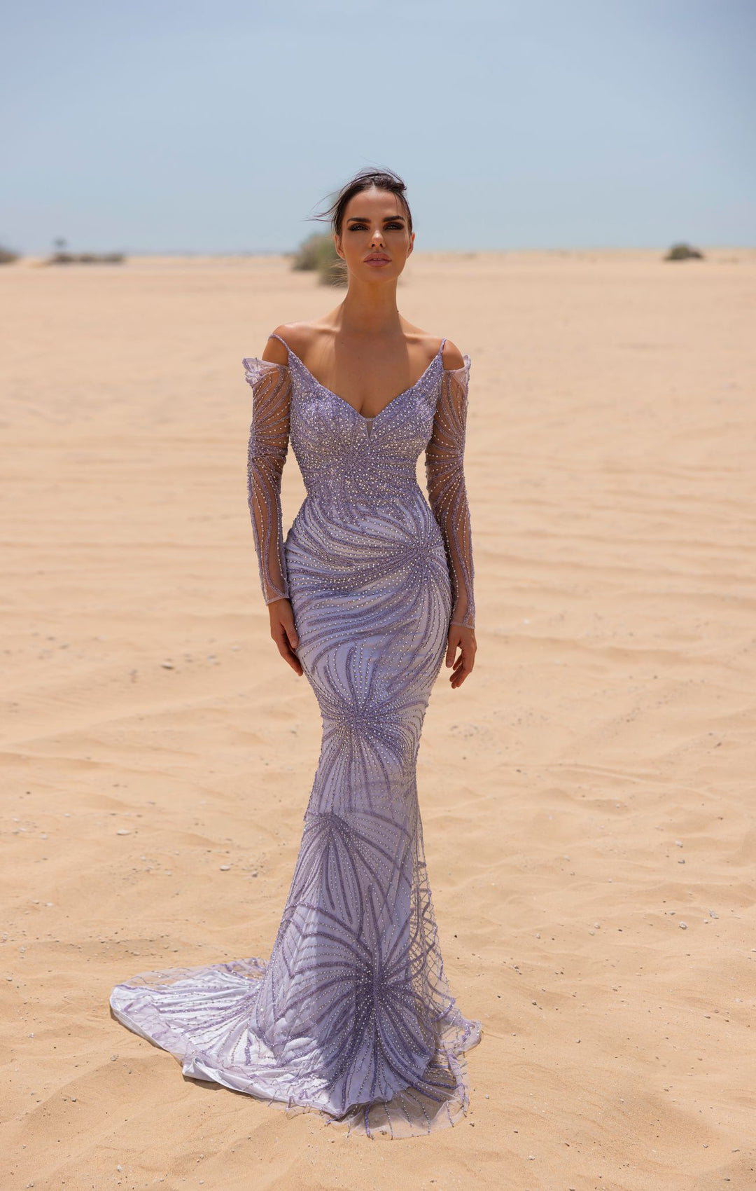 Metallic, metallic, metallic, oh my! Adore this shimmer metallic jersey gown made with horse hair edged trim and a wide open back detailed with a delicate tie.