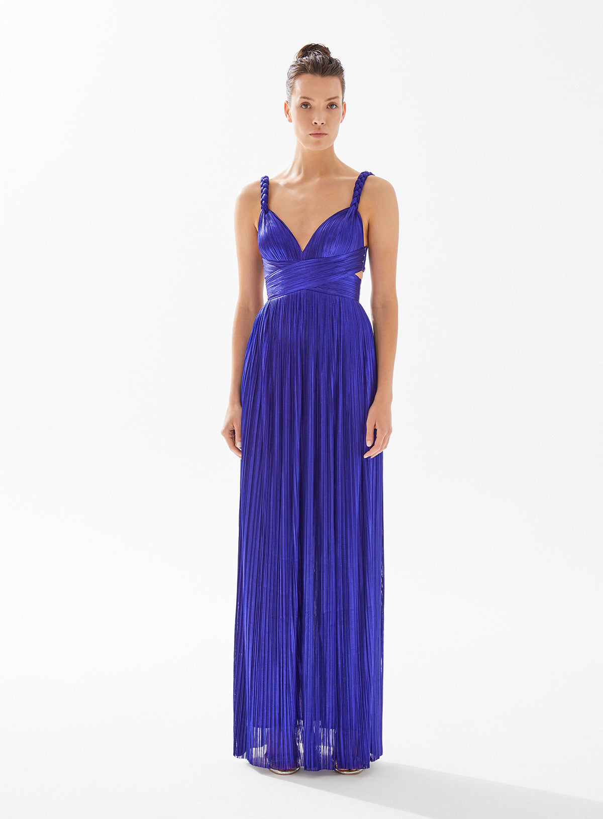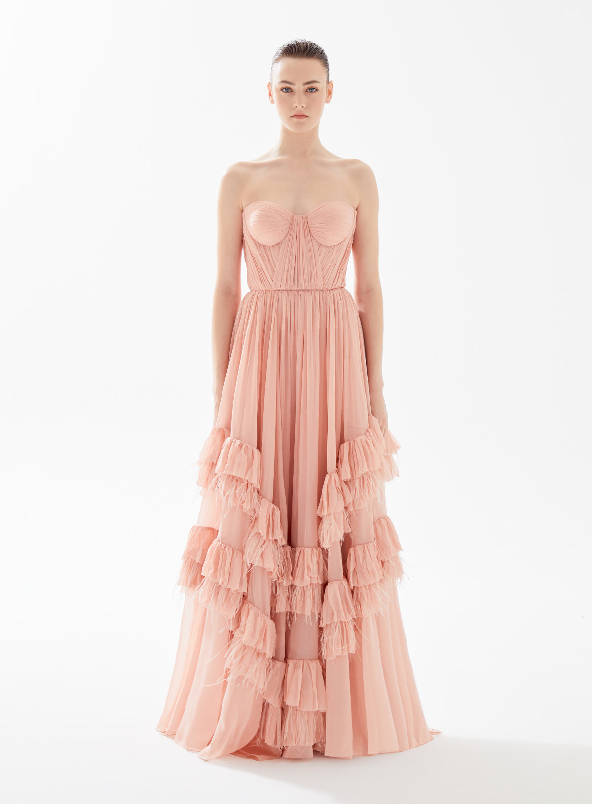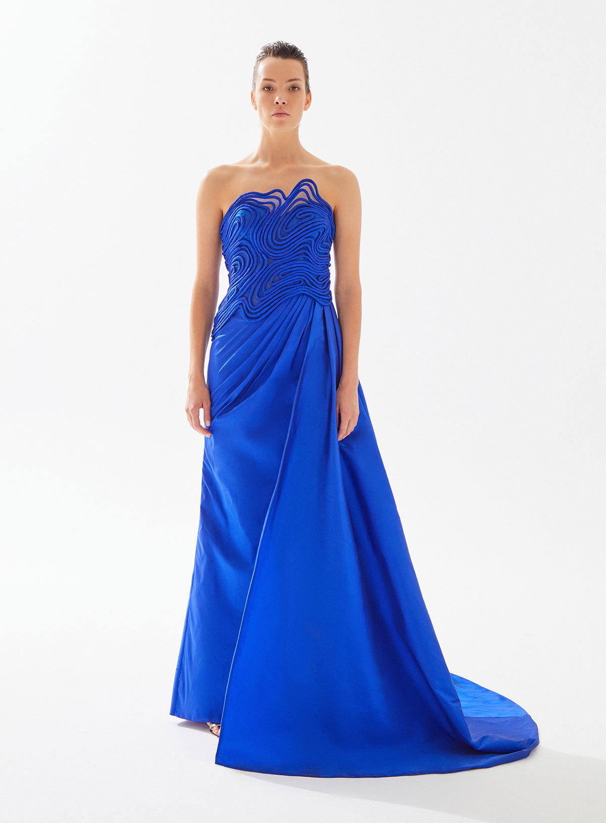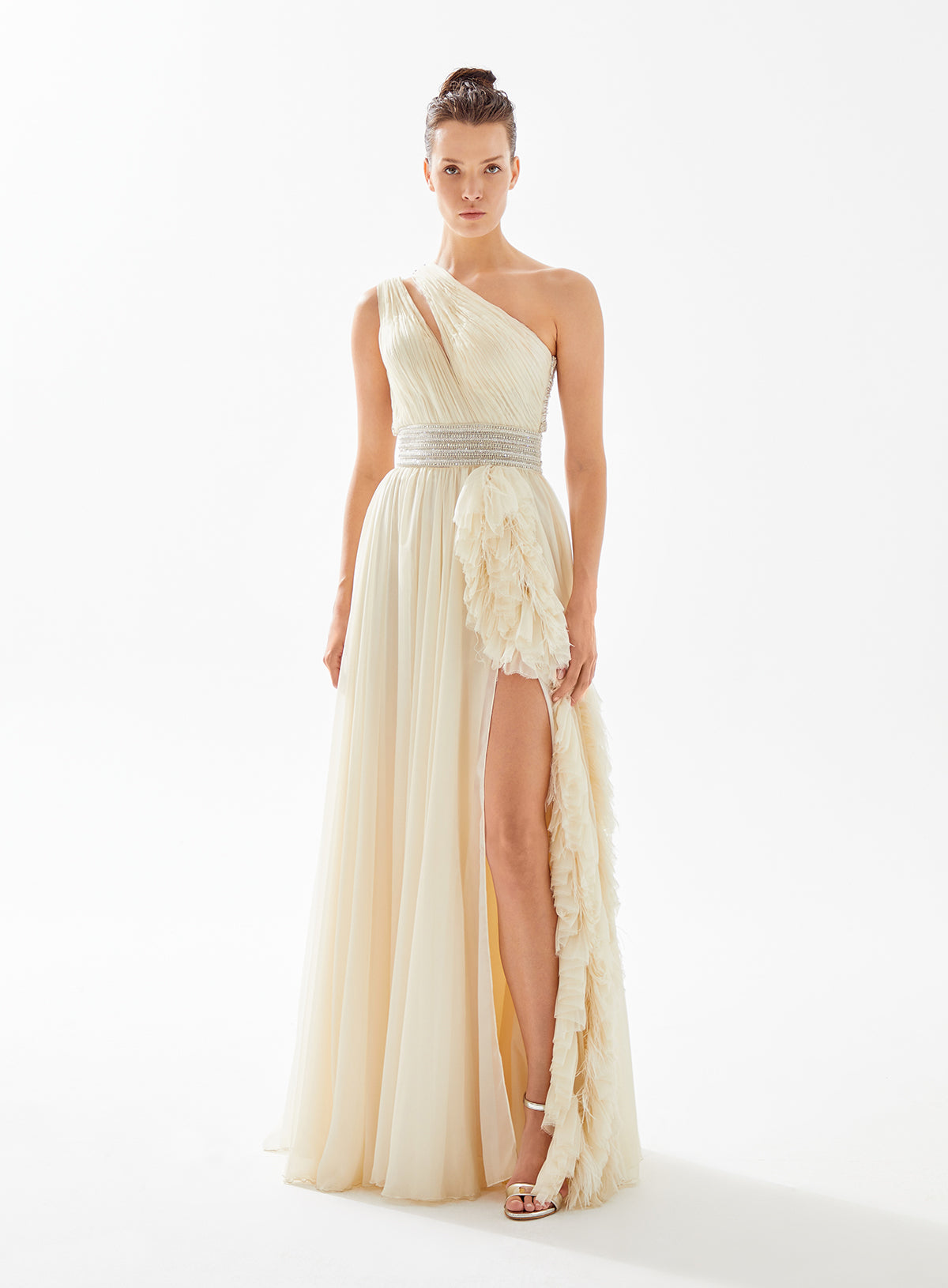 Everything good, everything magical happens in this sophisticated lycra jersey dress. This gown was crafted with a scoop neckline and beaded straps leading to a gorgeous strappy back. Finished off with an added jersey train falling from the beaded lower back.