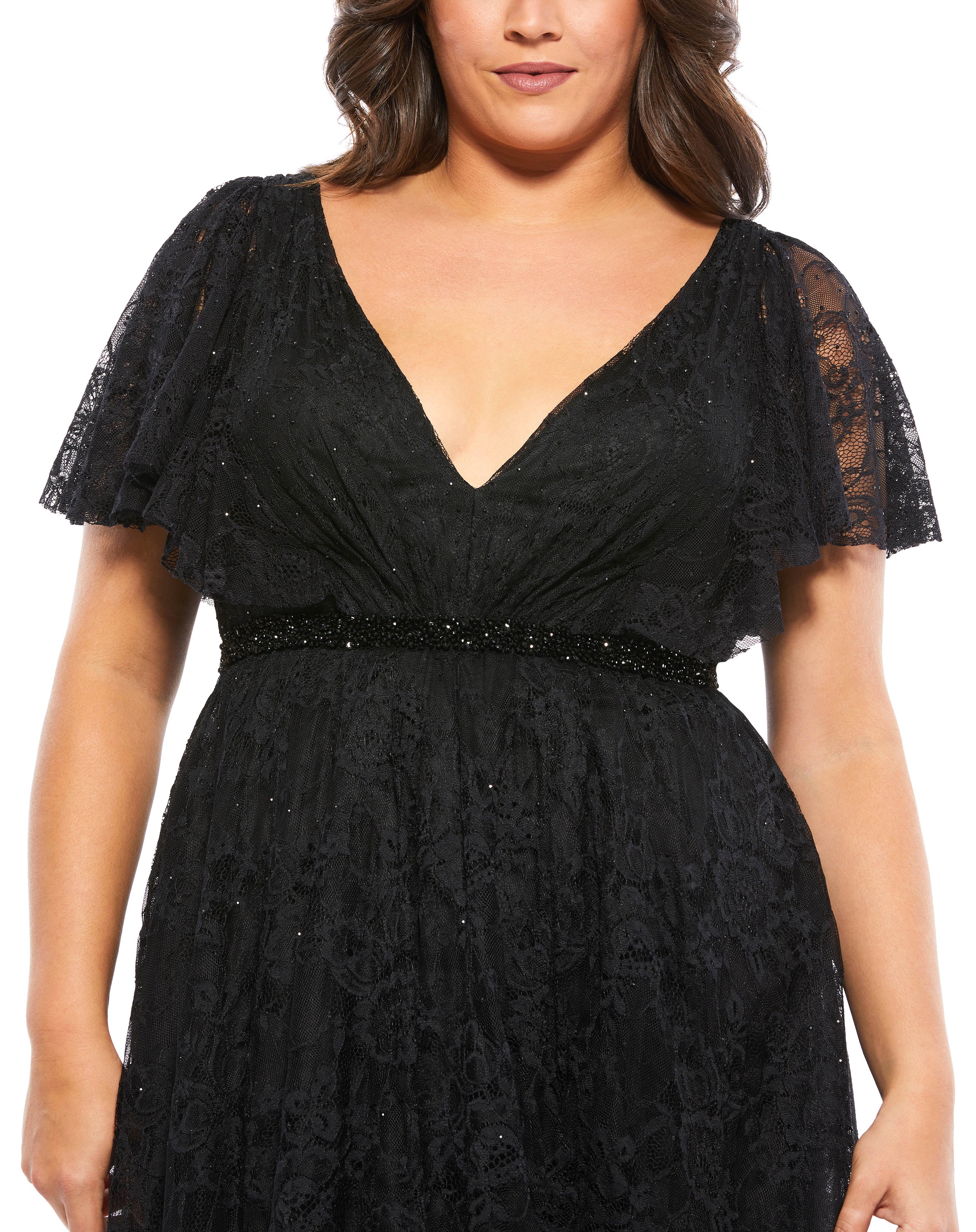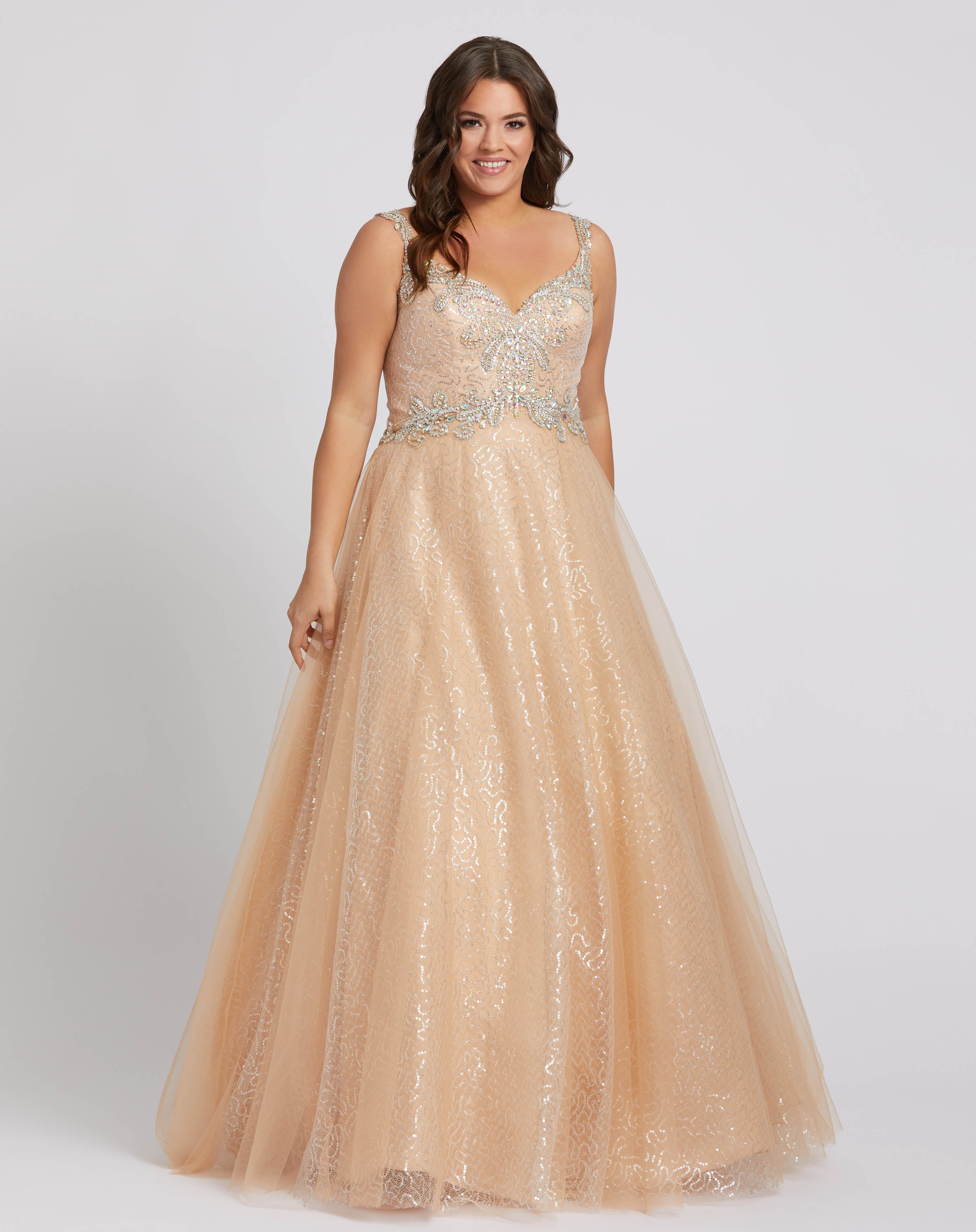 DECADENT AND EXTRAVAGANT GLITTER TULLE A-LINE WEDDING DRESS WITH A PLUNGING ILLUSION NECKLINE WITH CRYSTAL BEADING THROUGHOUT. THE DRESS FEATURES A SHEER BACK BODICE WITH A LOW-CUT OUT. THE GOWN FINISHES WITH A ZIPPER CLOSURE AND FULL CHAPEL LENGTH TRAIN. DETACHABLE MODESTY PANEL IS INCLUDED.