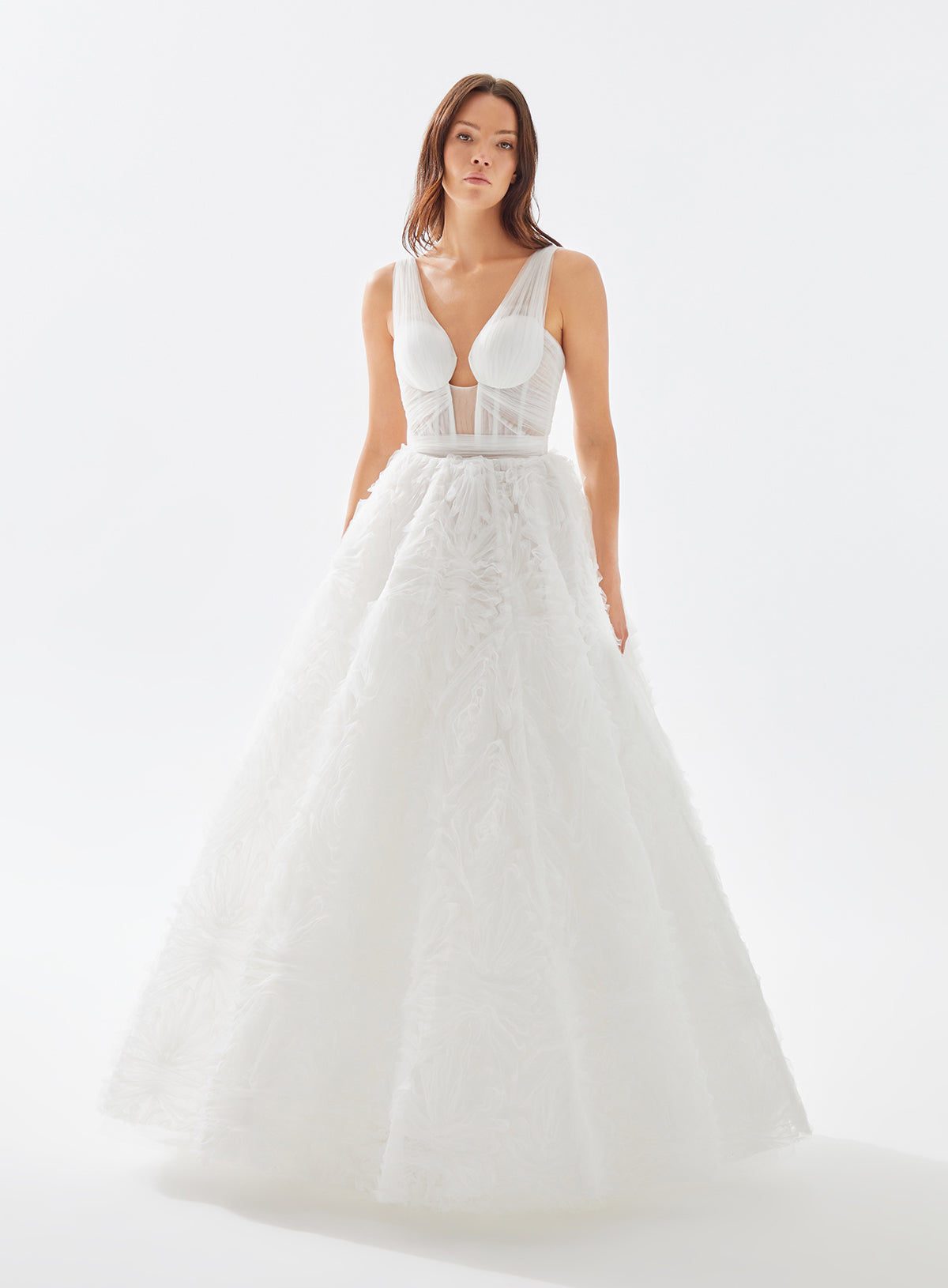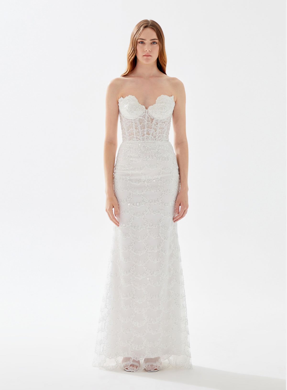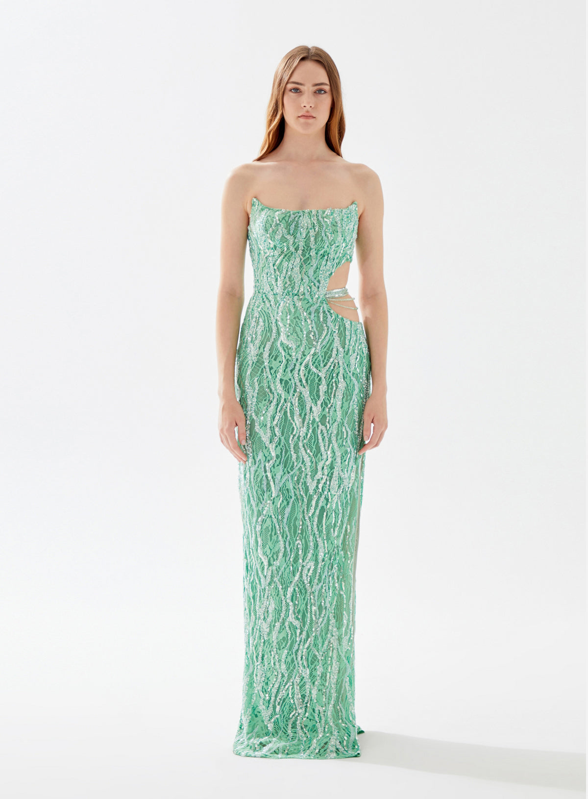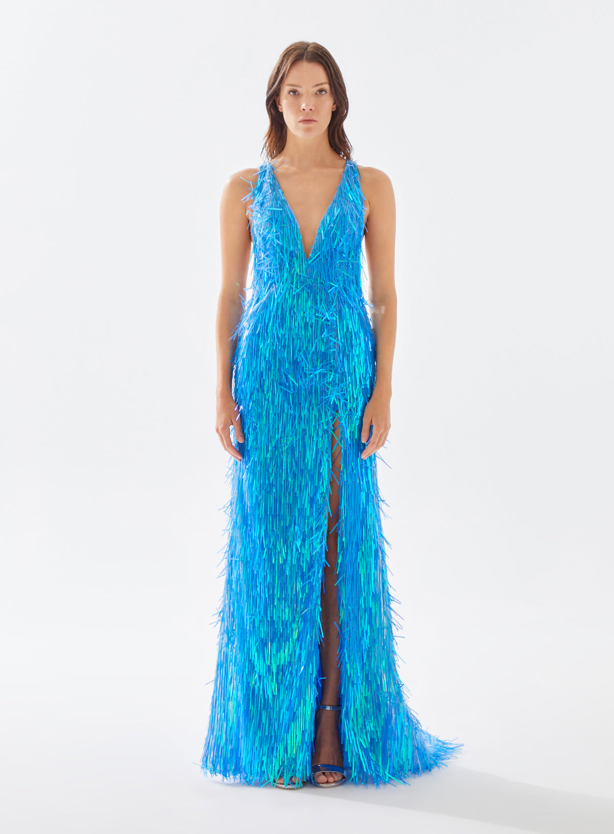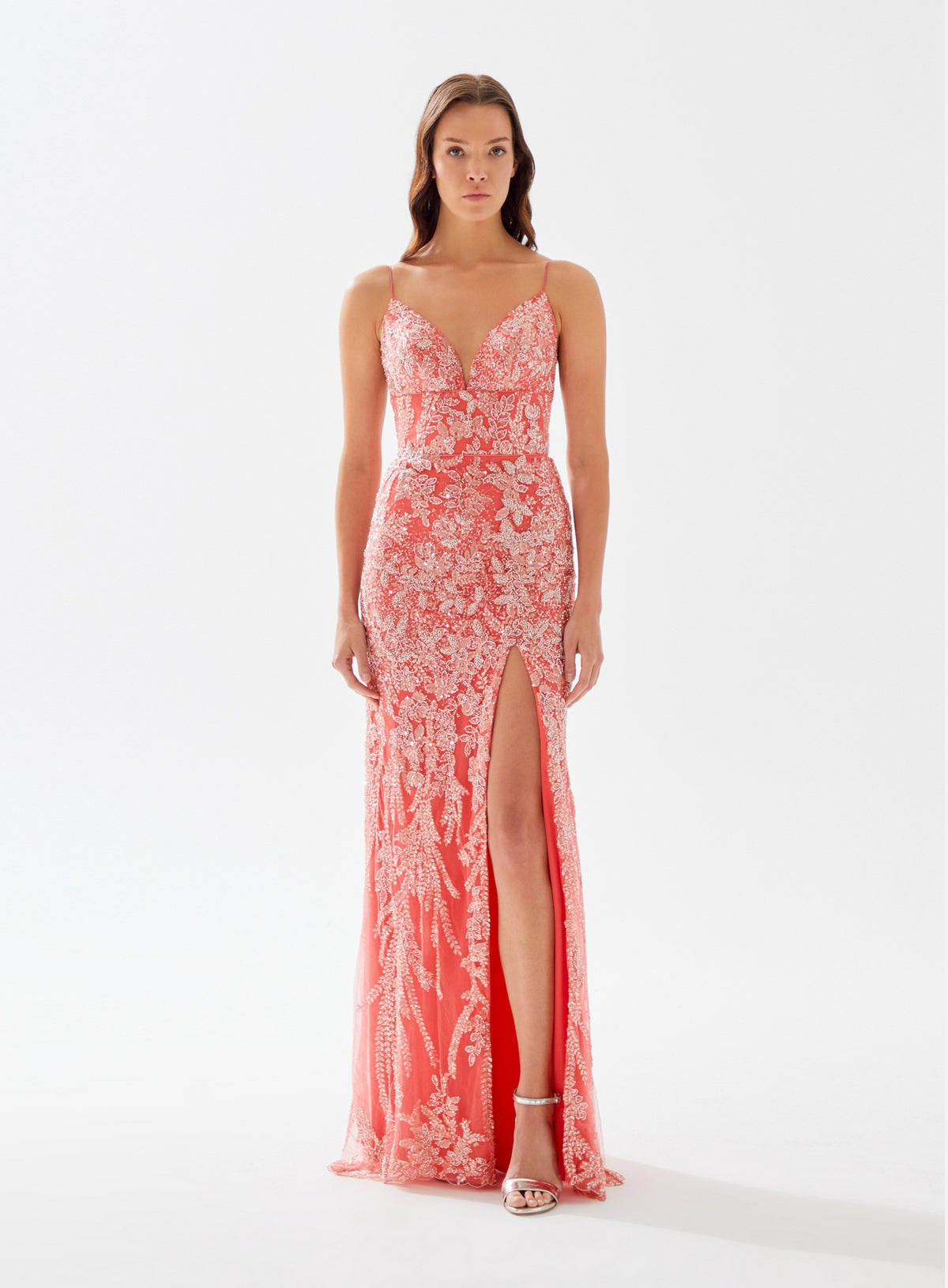 This gem will never go out of style. Rock your prom or next event wearing this deep plunging, fully beaded floor length dress. It is embellished with multi-colored stones on the bodice and a sophisticated open back.