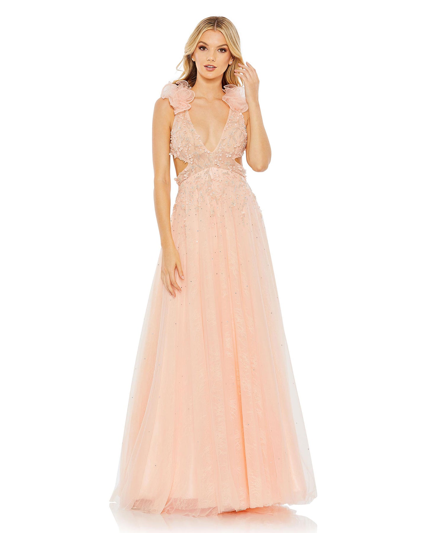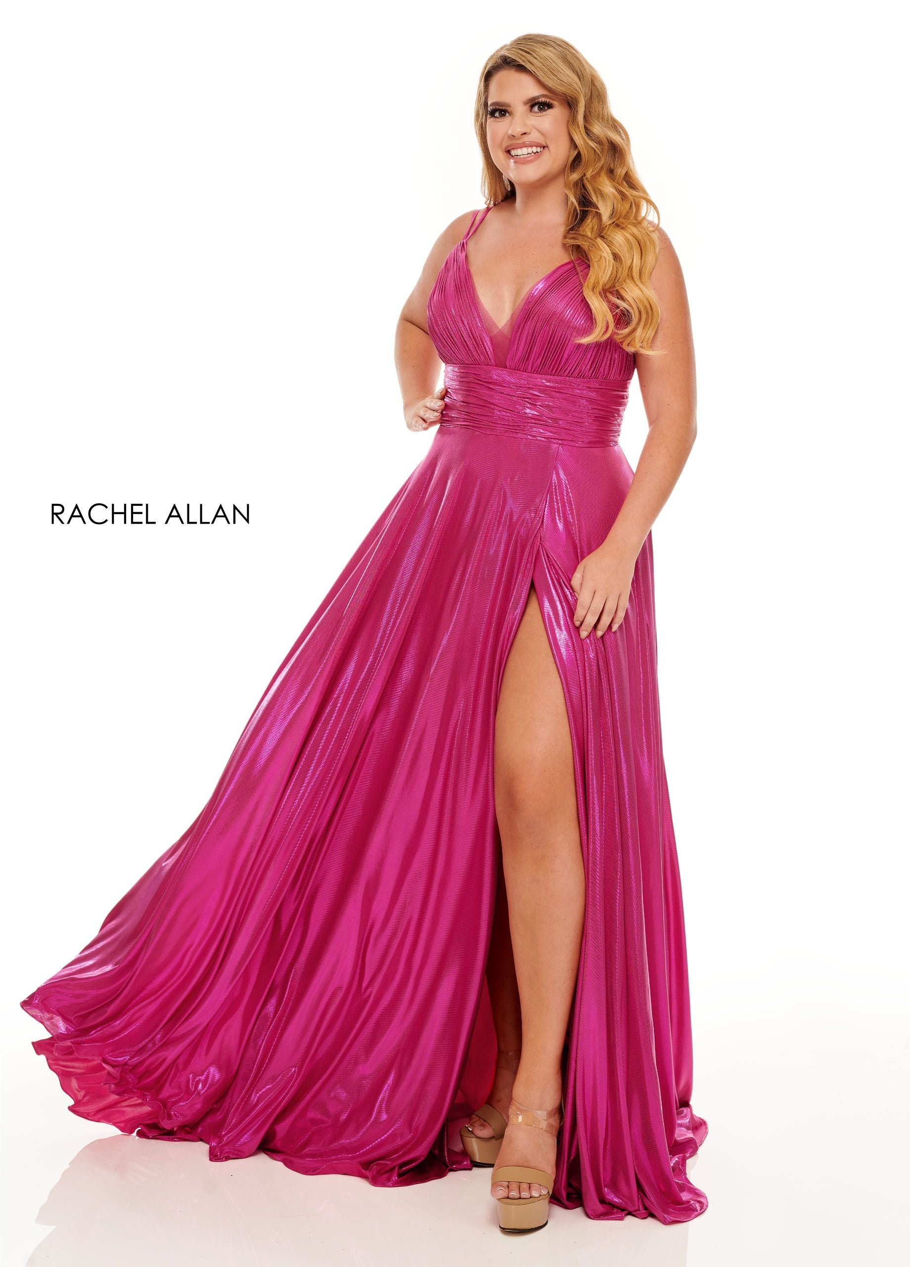 A metallic jersey is always a 'say yes to the dress' moment. This sensational A-line was made with a v-neckline and ruched bodice showcasing a shimmery effect.