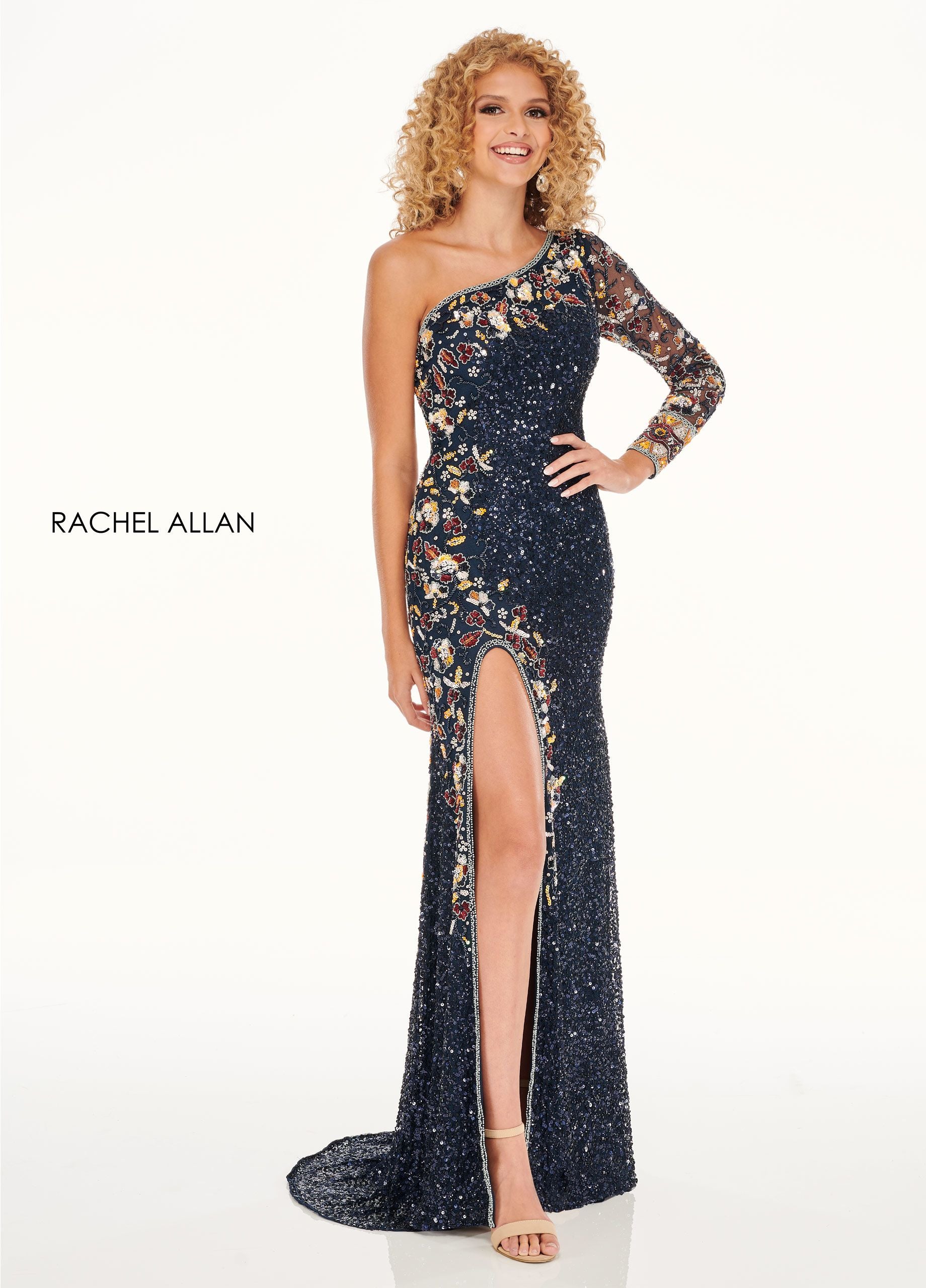 We are speechless when it comes to this one. Made from our top selling homecoming dress, style 40076, this one shoulder, long sleeve is made for you! Detailed with multi-colored stones and a mesh sleeve, you will steal the show wearing this gown.