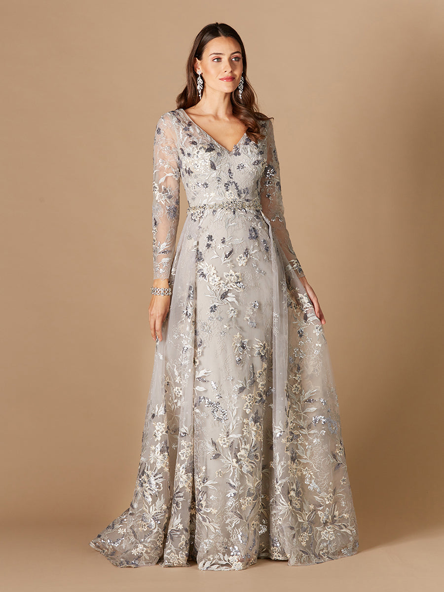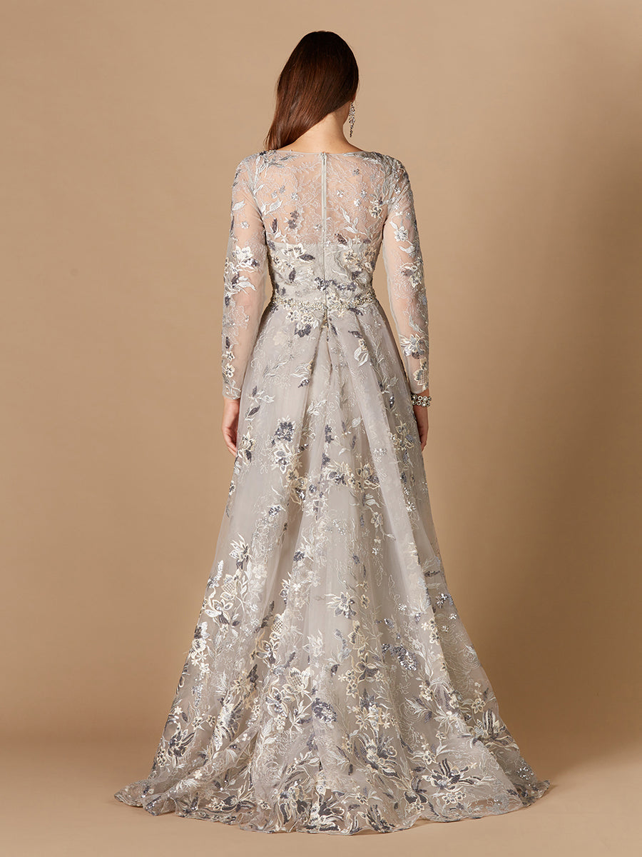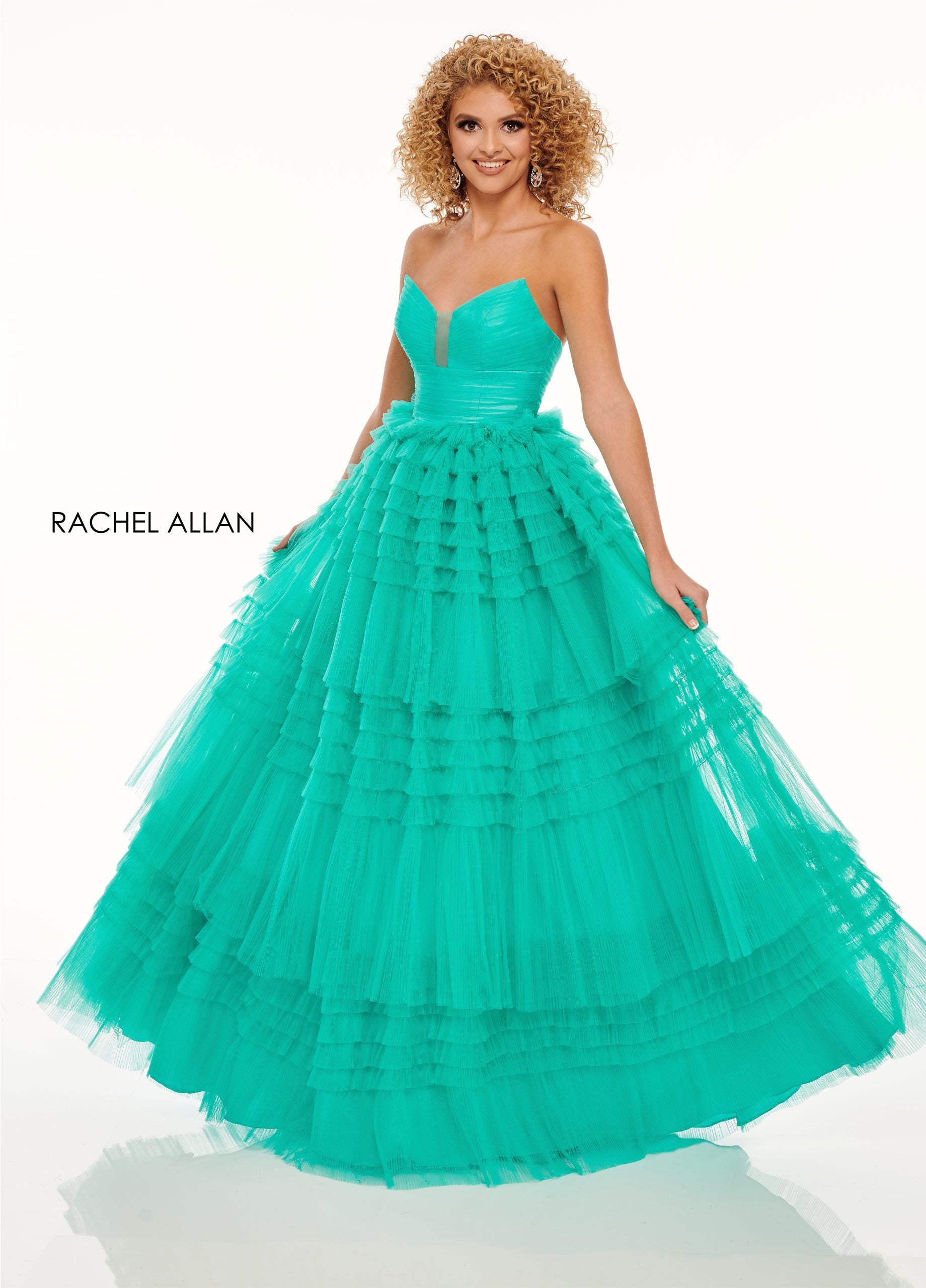 The holy grail of ballgowns. This strapless ballgown is bold and vivacious designed with a ruched bodice, a mesh center panel and a layered tulle skirt.