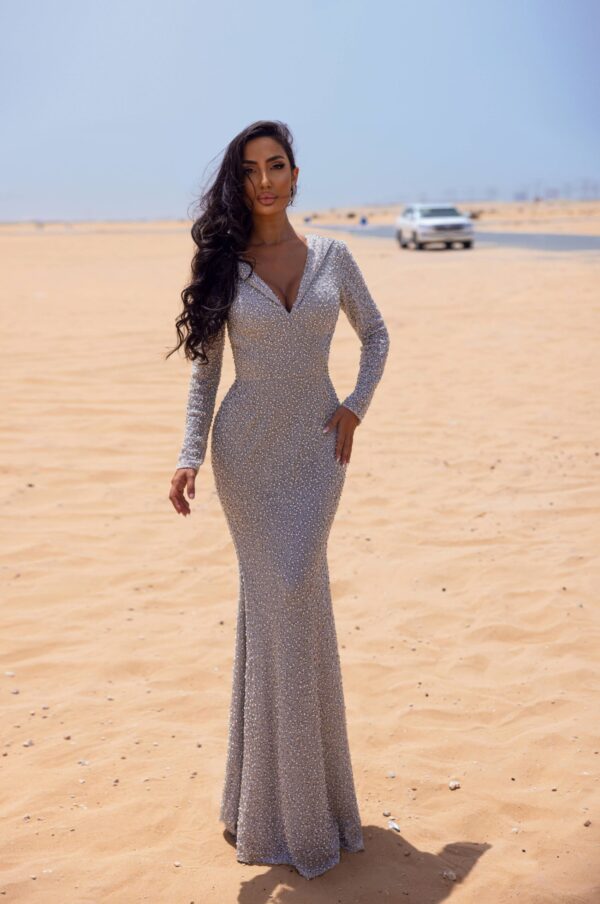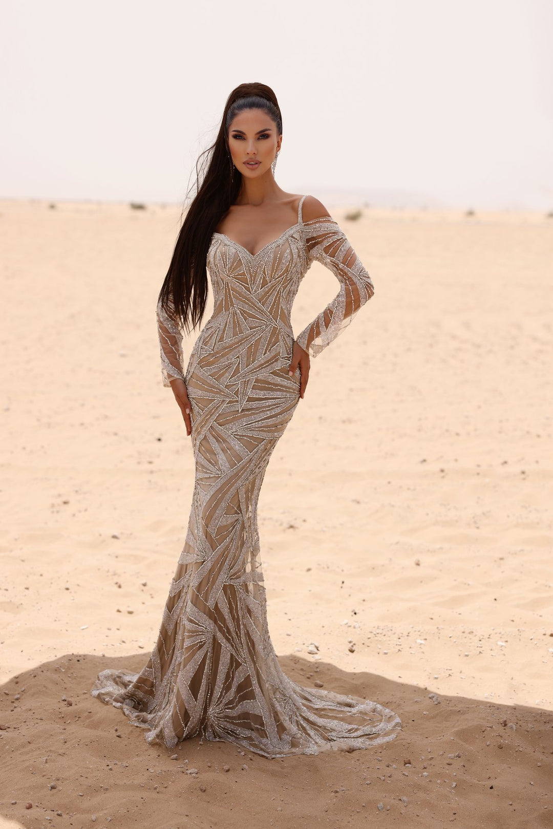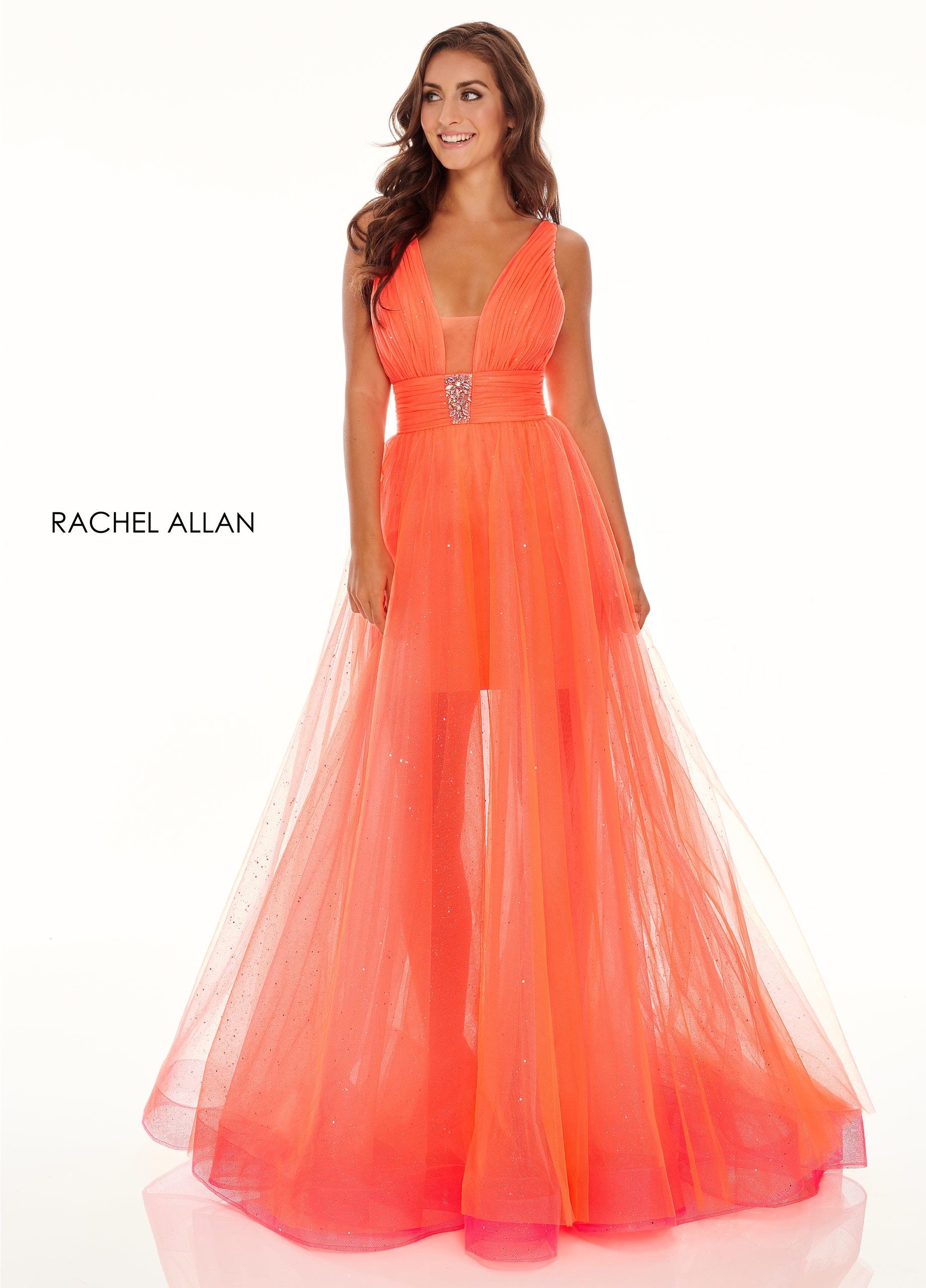 The night will sparkle and so will you wearing this fantastic glitter tulle A-line designed with a short skirt underneath the shimmer overlay. We added a plunging neckline and double beaded straps on the back to complete this gown.