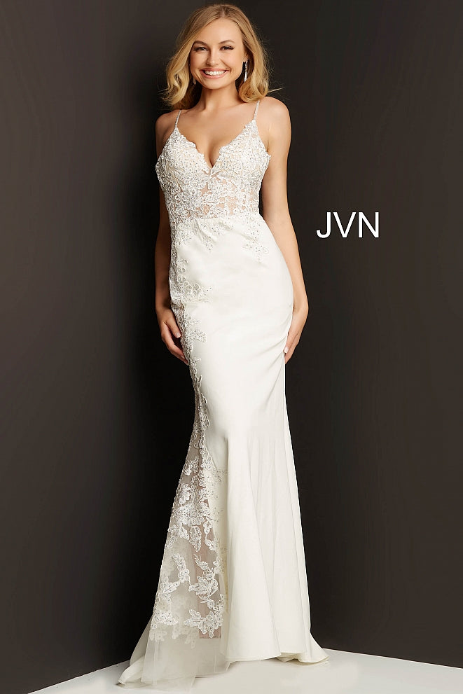 - Details: Form fitting full length prom dress, lace appliques sheer bodice and side, embellished with heat set stones, spaghetti strap bodice with V neck, open back. Available in light blue, light pink and off white, sizes 00-24.