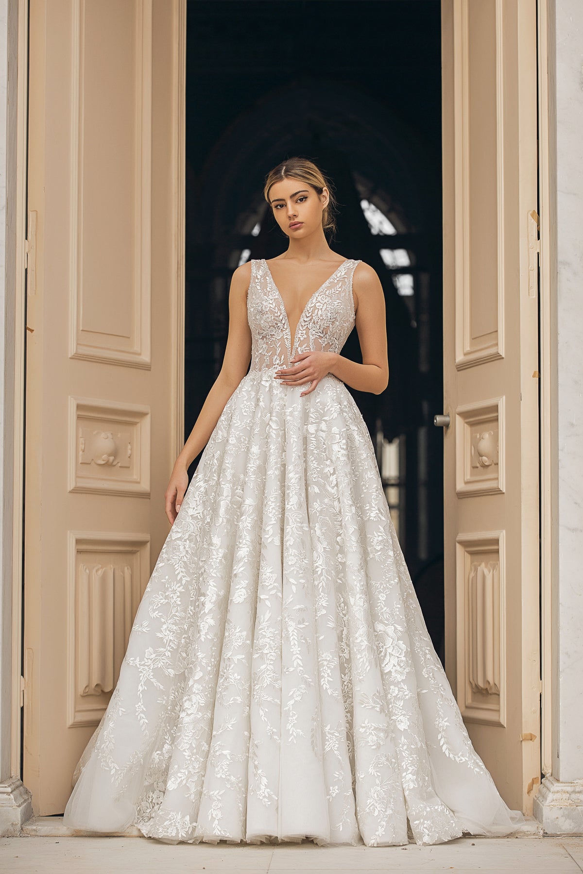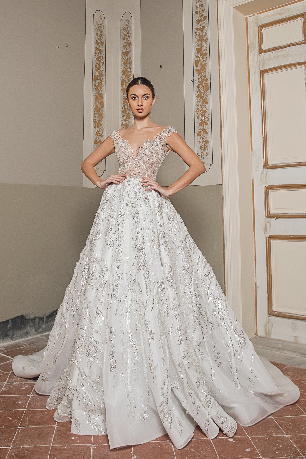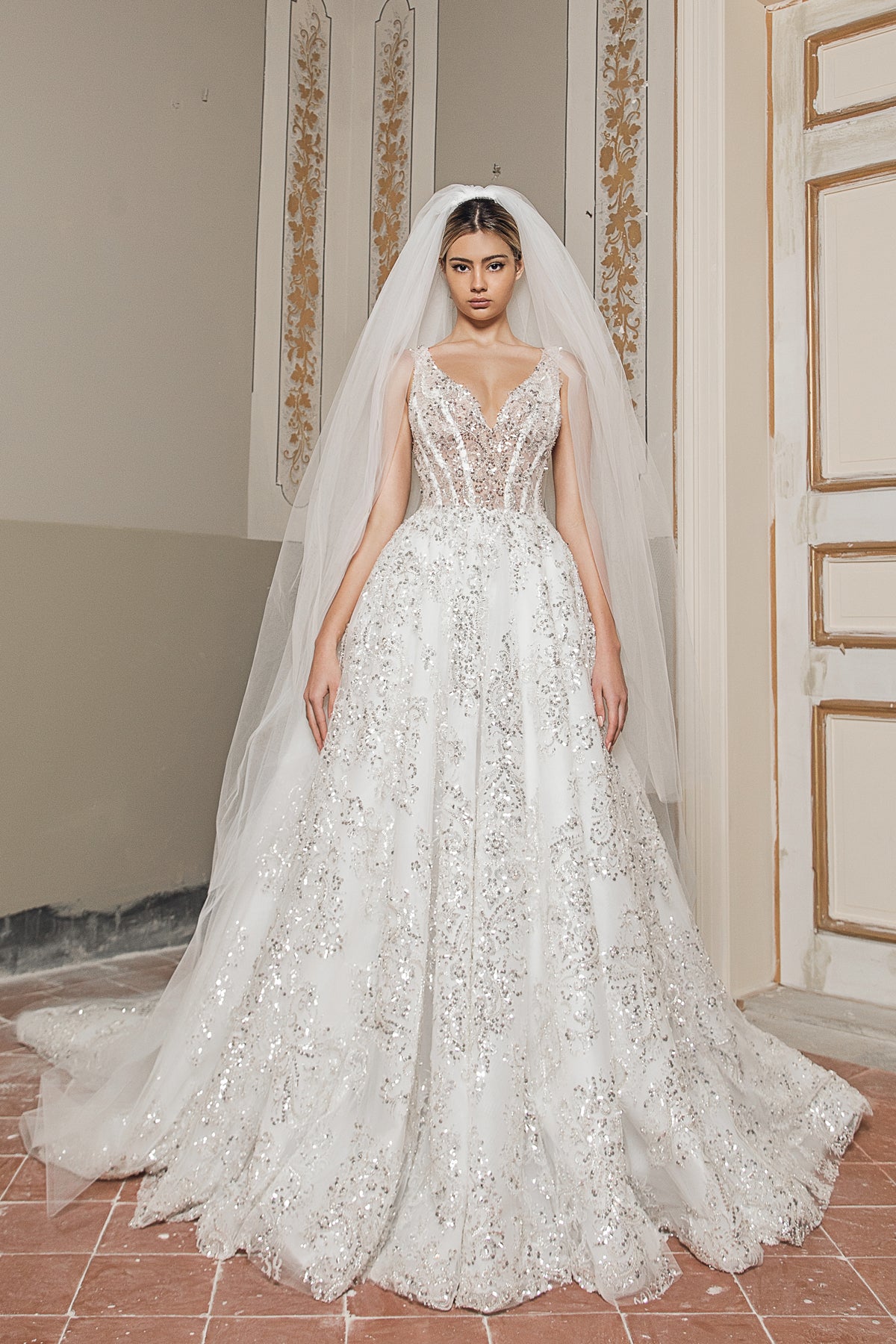 FULLY EMBROIDERED FIT AND FLARE WEDDING DRESS WITH A SWEETHEART NECKLINE, SHEER BACK BODICE AND GLITTERING SEQUIN EMBROIDERY TO MATCH. THE GOWN FEATURES DELICATELY BEADED THIN STRAPS, A KEYHOLE BACK AND BEAUTIFULLY FLARED SKIRT FINISHING WITH A CHAPEL LENGTH TRAIN. DETACHABLE MODESTY PANEL IS INCLUDED.