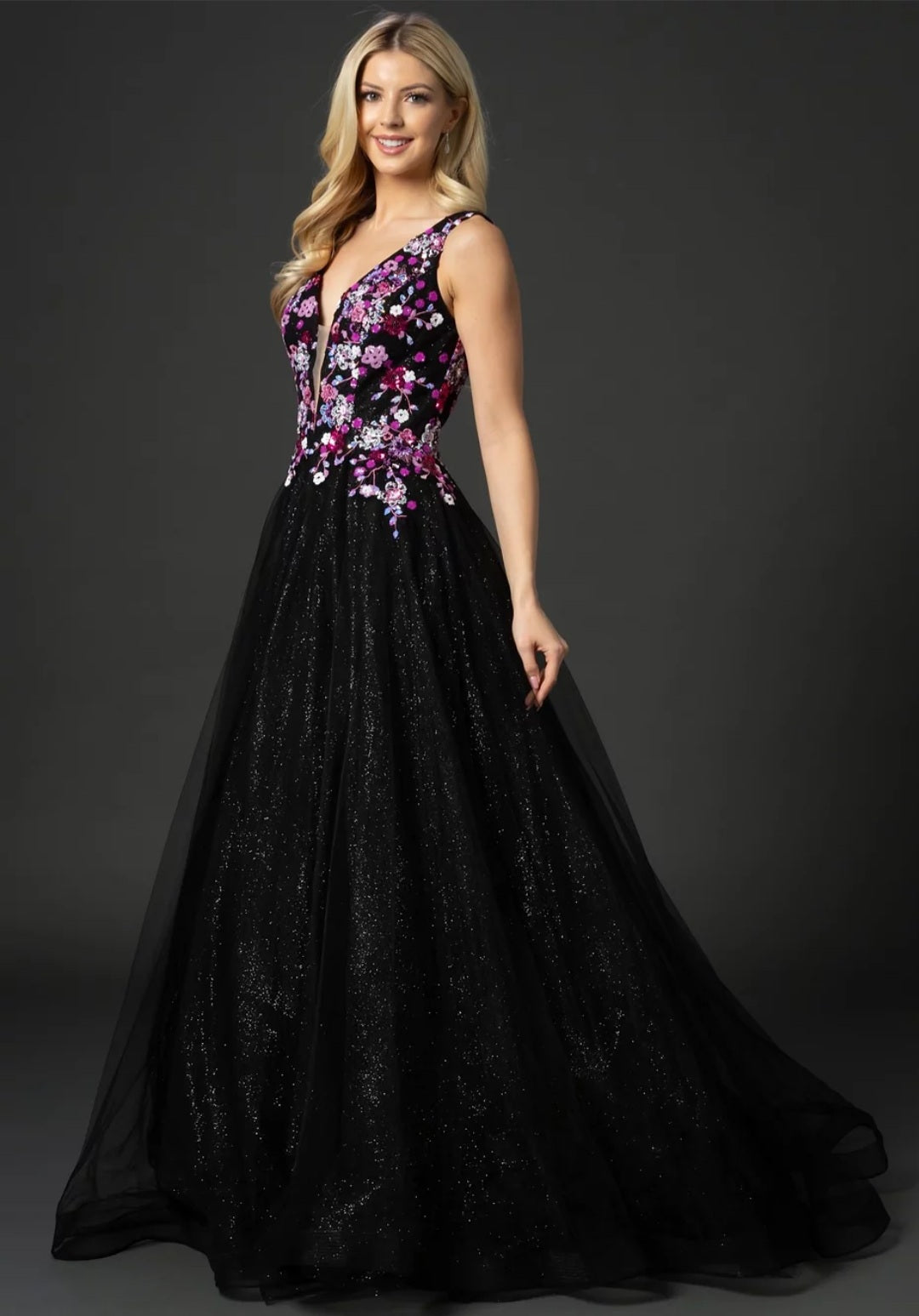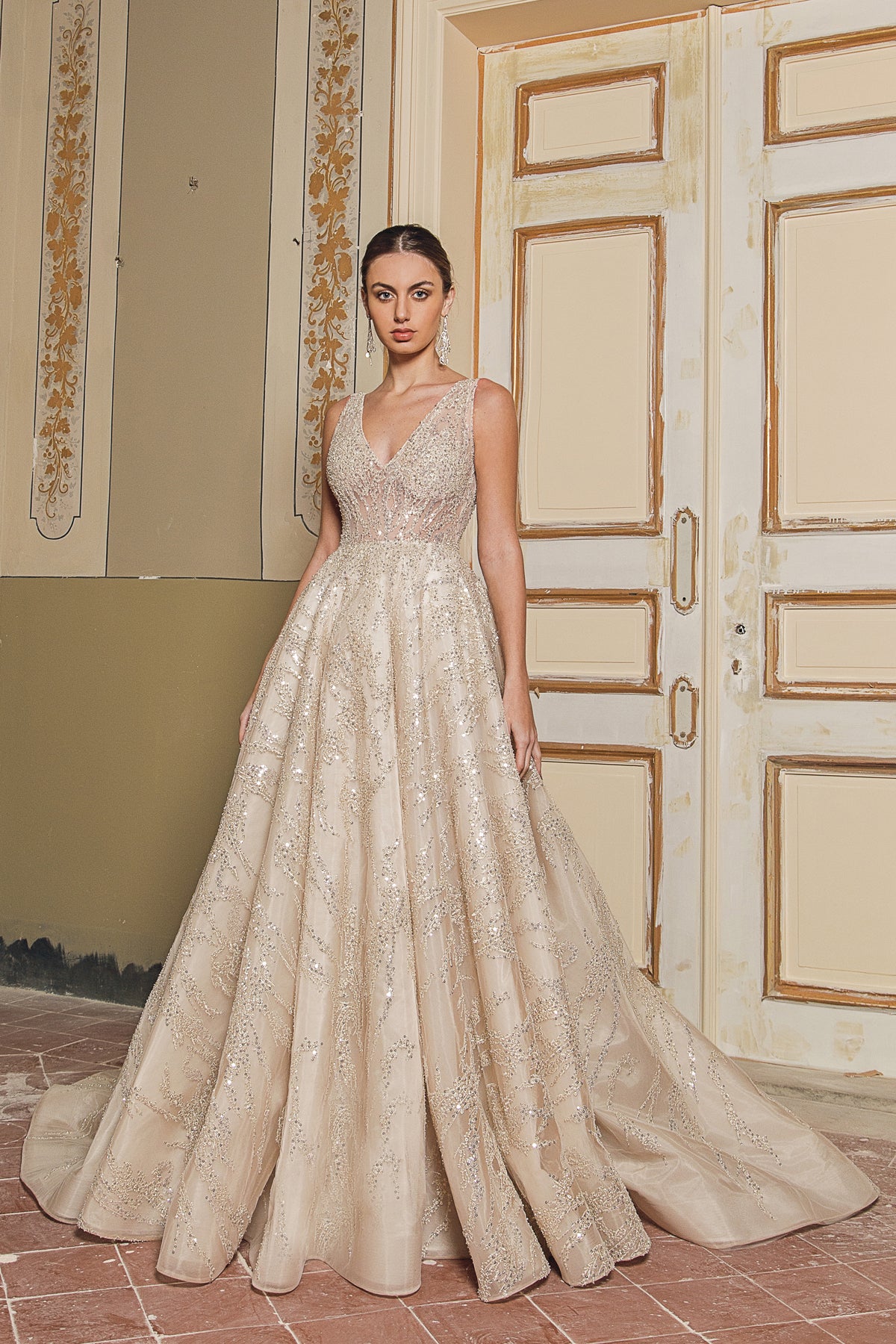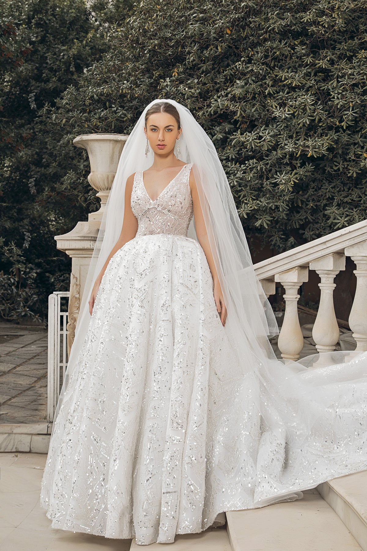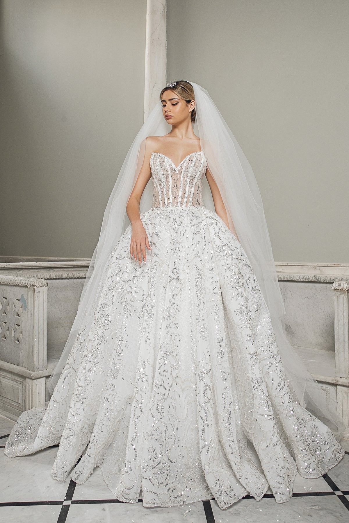 FULLY EMBROIDERED FIT AND FLARE WEDDING DRESS WITH A SWEETHEART NECKLINE, SHEER BACK BODICE AND GLITTERING SEQUIN EMBROIDERY TO MATCH. THE GOWN FEATURES DELICATELY BEADED THIN STRAPS, A KEYHOLE BACK AND BEAUTIFULLY FLARED SKIRT FINISHING WITH A CHAPEL LENGTH TRAIN. DETACHABLE MODESTY PANEL IS INCLUDED.