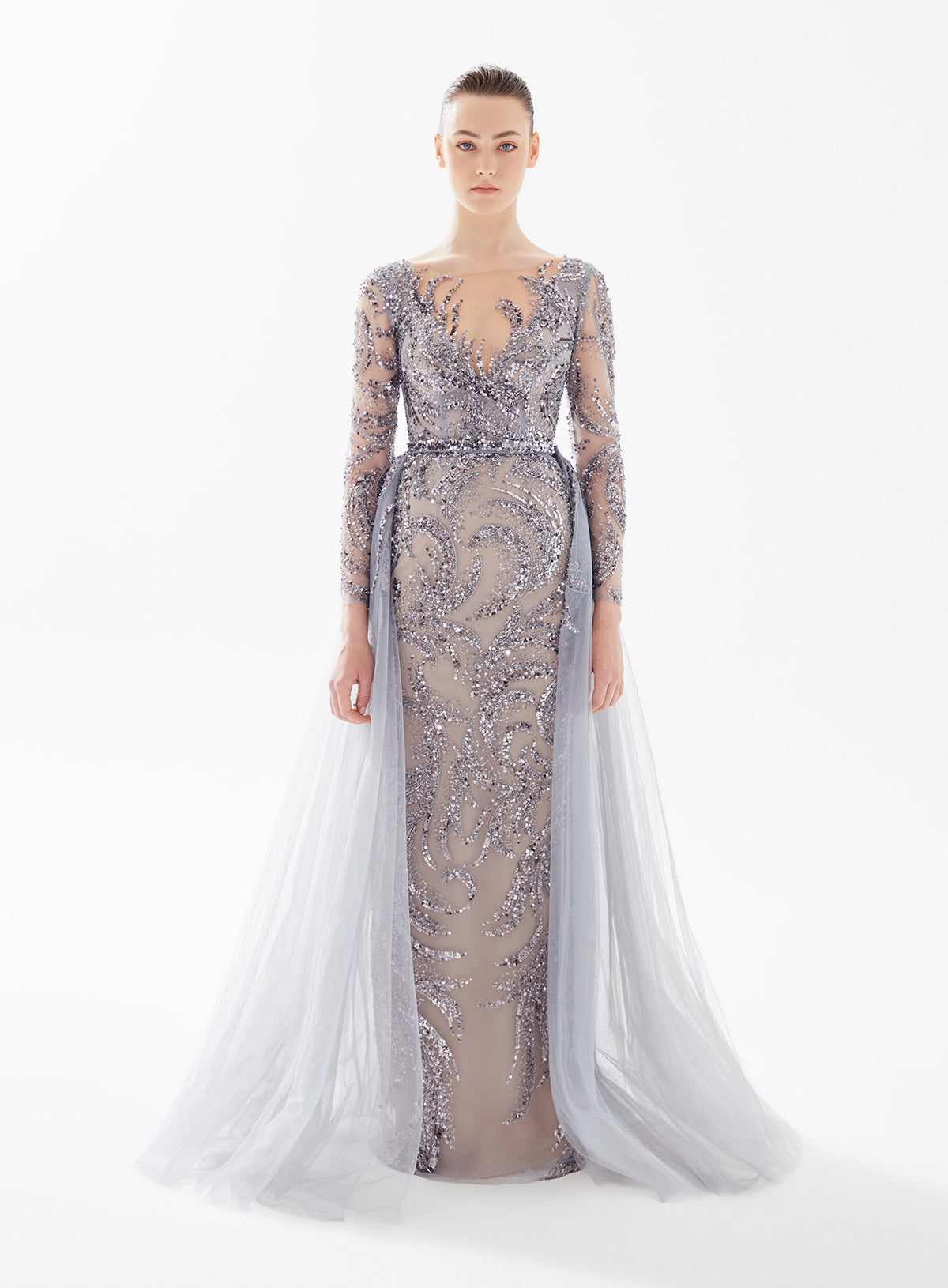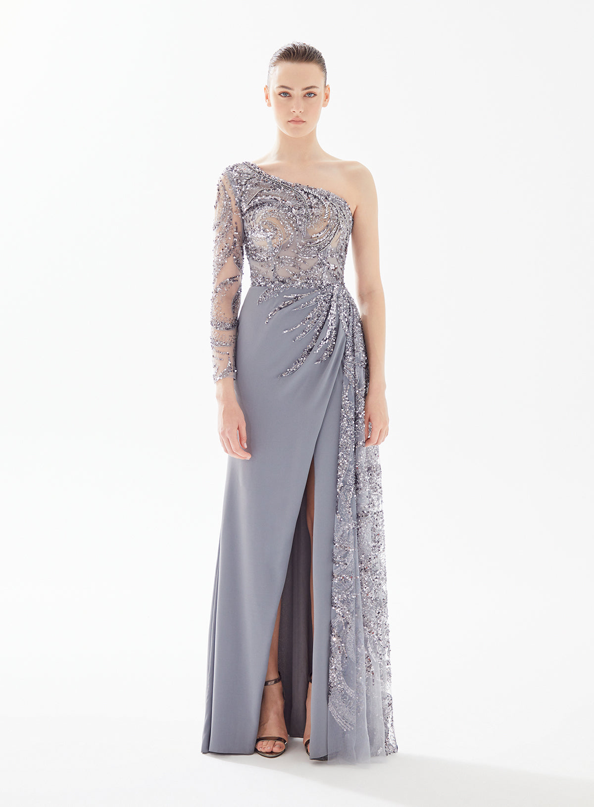 Hot little one-shoulder number! How cute is this sequin/glitter combo designed with a bodice and highlighted with a high slit.
