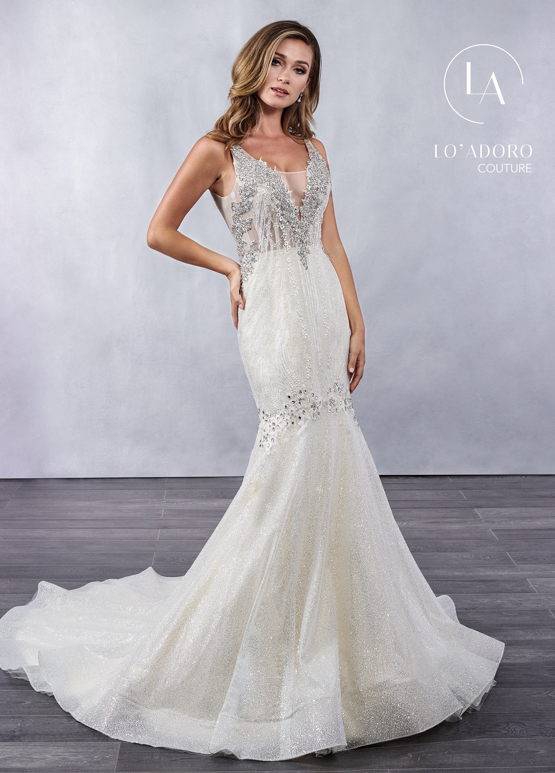 MAGICAL FIT AND FLARE WEDDING DRESS WITH A FULLY BEADED TULLE OVERLAY MADE OF FLORAL BEADING ACCENTING THE SILHOUETTE AND FRINGE SHOULDER DETAILS. THE ENTIRE GOWN HAS BEEN BEADED THROUGHOUT WITH SPARKLING STONES AND CRYSTAL BEADING. THE GOWN FINISHES WITH A PLUNGING BACK BODICE, ZIPPER BACK CLOSURE AND A SWEEP TRAIN.