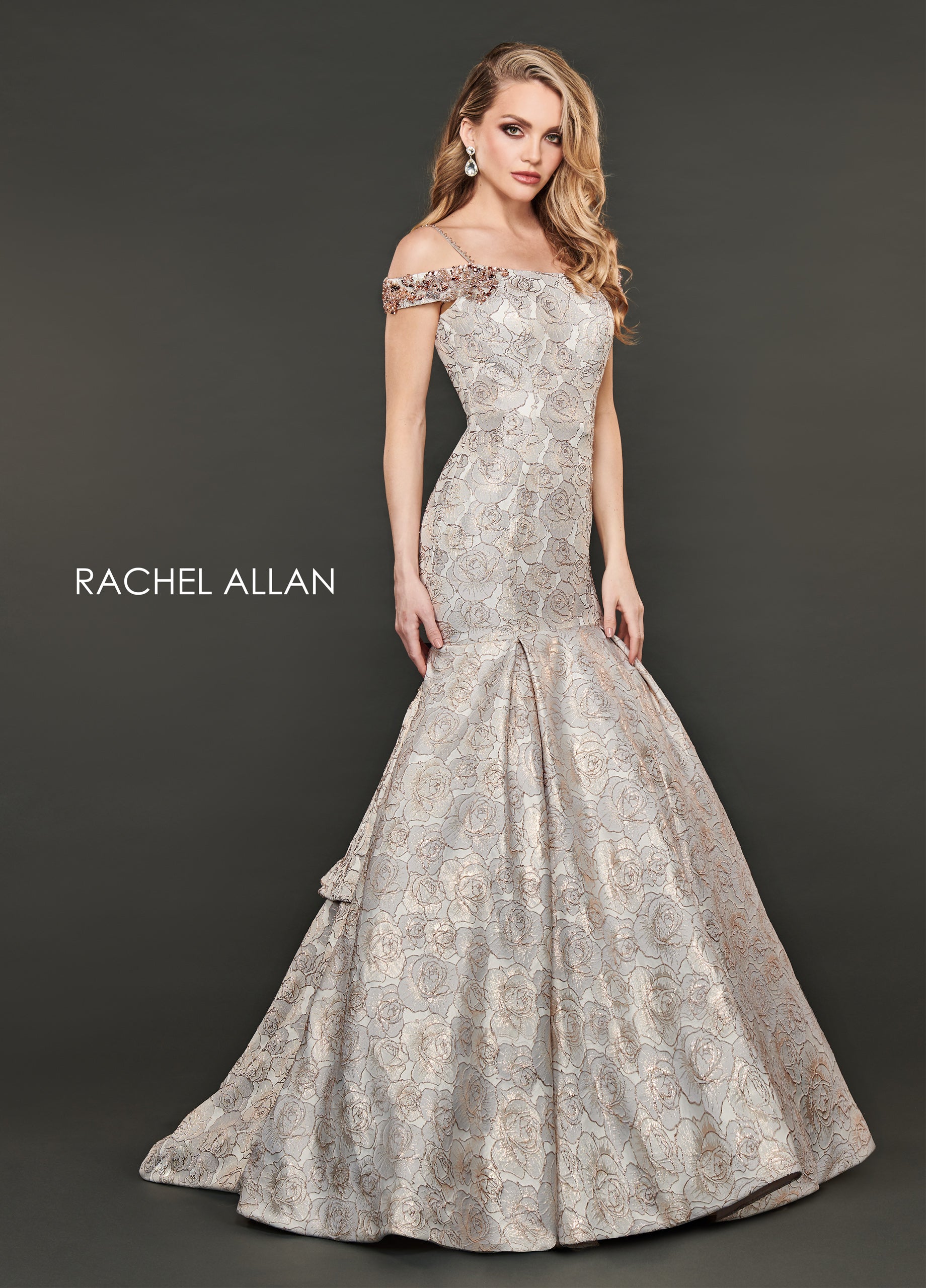 A stunning mermaid gown that is a metallic floral jacquard fabric with a mermaid silhouette. The off the shoulder straps are delicately beaded for an elevated touch of detail. The back of the dress has a charming tiered ruffle perfect for the red carpet.
