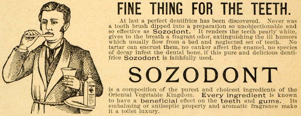 Sozodont. In 1859, New Jersey native Roswell van Buskirk created the dentifrice Sozodont, which came in a spray bottle and could be applied to toothbrushes to achieve optimal oral hygiene. The product got its name from the Greek word sozo Òto saveÓ and dontia Òteeth.Ó Sozodont advertising claimed to preserve the teeth, harden the gums, prevent tartar and stop tooth decay. The company attained endorsements from reputable dentists, chemists and physicians, advocating the products effectiveness. However, later claims founded the dentifrice actually stained teeth a dark yellow and destroyed tooth enamel, attesting that the alkaline base was too strong for general everyday use. Hall & Ruckel of New York City and London, England took over the manufacturing of Sozodont and changed the name to Van BuskirkÕs Fragrant and Antiseptic Sozodont.