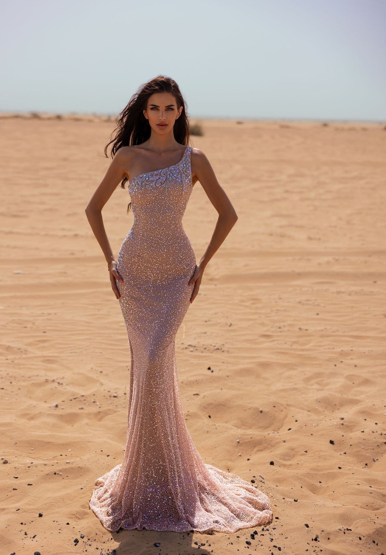 Date night or Prom, either way this gown was made for YOU! We love the simplicity in this jersey scoop neck dress designed with a racer-back effect and silver rhinestones outlining the high slit.